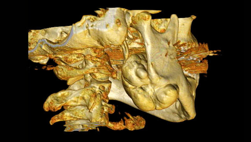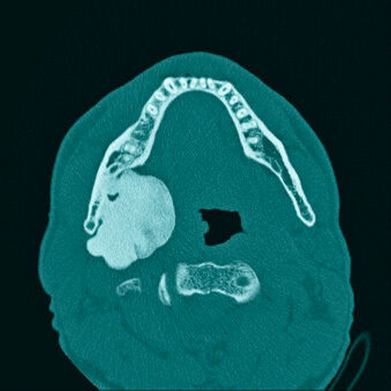 Im mitgebrachten alio loco erstellten Orthopantomogramm war eine gut abgrenzbare, ovale, homogene Verschattung zu sehen, welche sich im Bereich des rechten Kieferwinkels, in dorsaler und kranialer Richtung über diesen hinaus sowie im Bereich des aufsteigenden Unterkieferastes bis kaudal unter die Incisura semilunaris erstreckte (Abbildung 1). Computertomografisch war ausgehend von der medialseitigen Corticalis des Angulus mandibulae rechts eine irregulär, angedeutet rundlich konfigurierte, glatt begrenzte knöcherne Raumforderung von circa 4,4 x 3,3 x 4,7 cm Größe zu sehen (Abbildungen 2 und 3). Diese führte zu einer Verlagerung der Anatomie, insbesondere zu einer Vorwölbung der rechtsseitigen Oropharynxseitenwand (Abbildung 4). Es bestanden keine Hinweise auf eine knöcherne Destruktion oder auf eine Lagebeziehung zu einem Zahn.