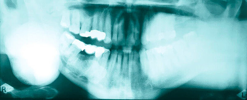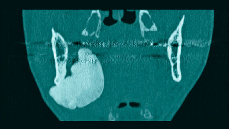 Extraoral war eine harte, etwa 5 cm x 5 cm große, nicht druckdolente und nicht verschiebliche Raumforderung zu palpieren. Es bestand keine Hypästhesie im Bereich des dritten Trigeminusastes.