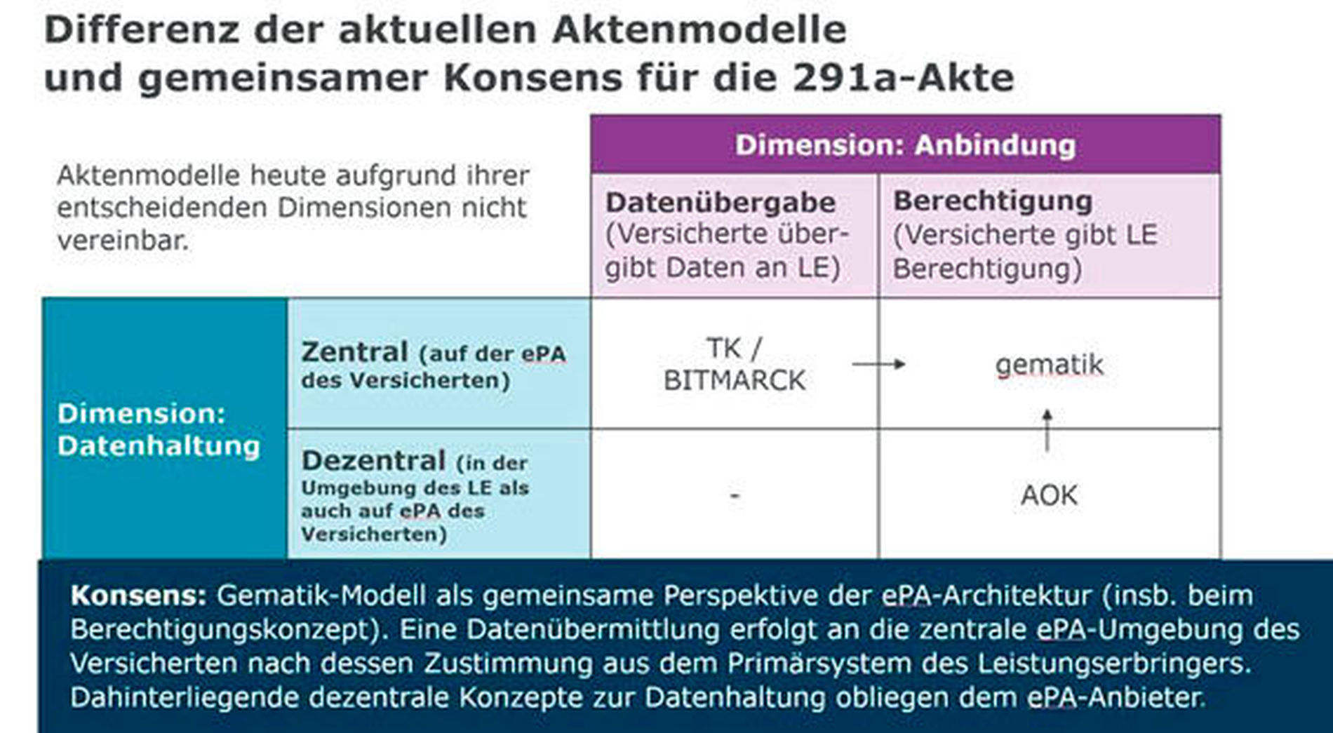 Grundlage für eine solche Akte ist das Modell der gematik: Sie soll die Architektur der ePA – soweit zum Beispiel für Sicherheit und Praktikabilität notwendig – einheitlich für alle Anbieter spezifizieren. Dafür soll sie technische Standards und Schnittstellen für die Hersteller von Konnektoren und ePAs definieren. Auch die notwendigen Zulassungen für Betreiber und Anbieter von ePA-Lösungen und Komponenten erfolgen durch die gematik, heißt es in dem Papier.