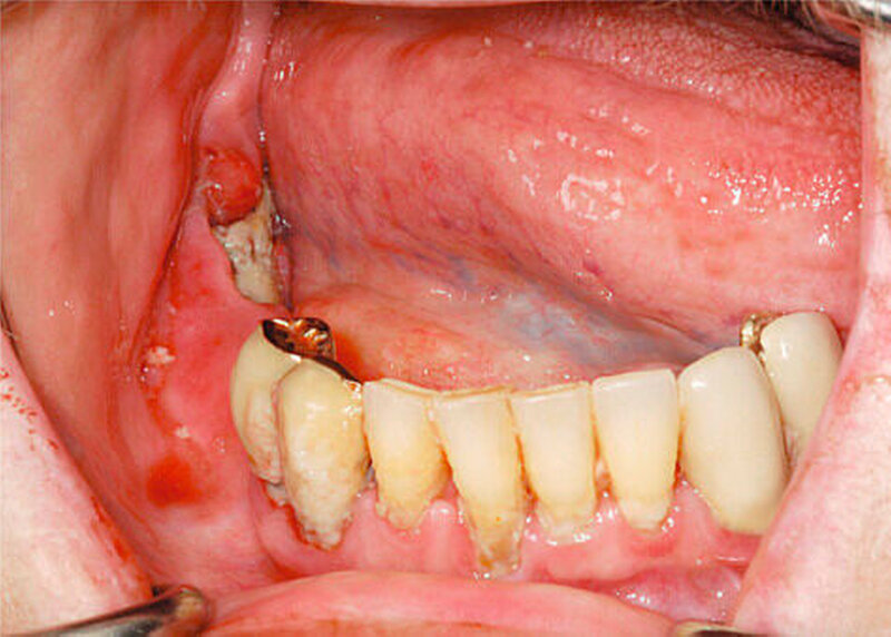 Neben den bekannten Bisphosphonaten werden zunehmend Fälle von Kiefernekrosen auch durch Denosumab, einen RANKL-Antagonisten, beobachtet. Deswegen sollte speziell auch nach den Medikamenten Prolia©und XGeva©vor oralchirurgischen Eingriffen gefragt werden. Während Prolia©in der Osteoporosetherapie Anwendung findet, wird XGeva©bei Prostata- und Mammakarzinompatienten subkutan verabreicht und hat speziell auch bei Nierenfunktionsstörungen seine Indikationen. Die Halbwertszeit von Bisphosphonaten beträgt bis zu zehn Jahren, die von Denosumab in der Regel zwischen 80 und 120 Tagen [Ruggiero, 2013]. In direkten Vergleichsstudien bei onkologischen Patienten werden etwas mehr gehäuft Nekrosen durch Denosumab als durch Zoledronat (Aminobisphosphonat) festgestellt. Die Erfolge einer definitiven Heilung waren jedoch bei den Denosumabnekrosen scheinbar besser [Saad et al., 2012; Van Wyngaert et al., 2011]. Als Hauptursachen einer Kiefernekrose sind bei beiden Präparaten nach wie vor Zahnextraktionen zu nennen. Das zweitgrößte Risiko durch Prothesendruckstellen wird jedoch häufig unterschätzt (Abbildungen 5 und 6) [Hoefert, 2012].