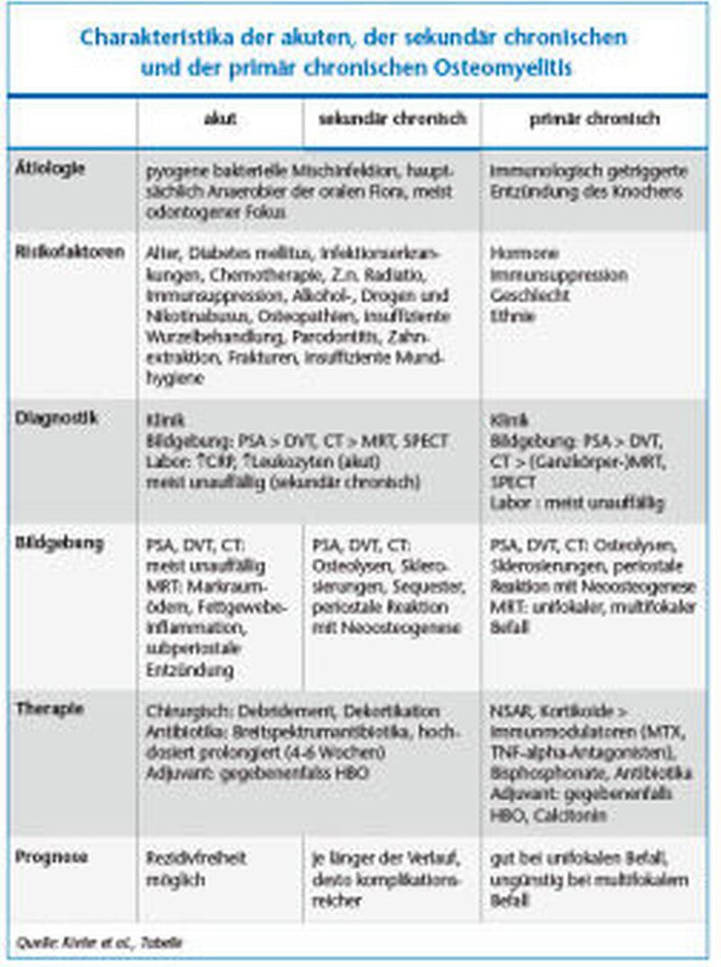Die primär chronischen und die sekundär chronischen Kiefer-Osteomyelitiden sind seltene Erkrankungen. Nicht selten werden sie infolge nicht oder erst spät diagnosti-ziert und kompetent behandelt, was für die betroffenen Kinder, Jugendlichen und Erwachsenen lange Monate bis Jahre des unnötigen Suchens, der Schmerzen und des Leidens bedeuten kann. Eine früh- zeitige korrekte Diagnosestellung und eine adäquate multimodale Therapie sind daher von entscheidender Bedeutung für die Prognose.