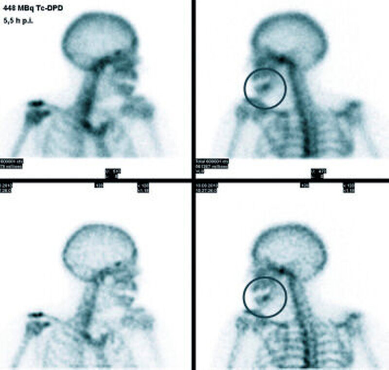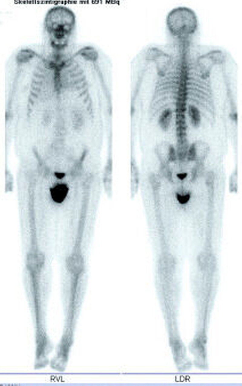 SPECT(single photon emission computed tomography)-Technik: Die diagnostische Akkuratesse der Szintigrafie kann durch Verwendung der SPECT gesteigert werden (Abbildung 2) [Dore et al., 2009]. Hier werden anders als in der Szintigrafie (in der Aufnahmen aus ventraler und dorsaler Projektion aufgenommen werden) mehrere Aufnahmen aus unterschiedlichen Winkeln akquiriert, aus denen ein dreidimensionales Bild errechnet wird. Dies verbessert die Detektion und die örtliche Zuordnung von fokal vermehrten Traceranreicherungen im Vergleich zu Szintigrafie oder CT allein [Bolouri et al., 2013].