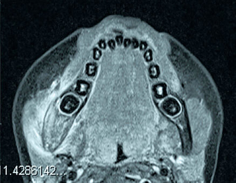 Primär chronische OM: Zur Behandlung der primär chronischen OM, somit auch der CRMO (Abbildungen 3 und 4) und des SAPHO-Syndroms (Abbildung 7), haben sich nicht steroidale Antiphlogistika (NSAR) und Kortikoide bewährt, bei Therapieresistenz Methotrexat (MTX), Bisphosphonate wie Pamidronat [Urade et al., 2012; Kuijpers et al., 2011] und TNF-alpha-Antagonisten wie Infliximab [Costa-Reis et al., 2013]. Adjuvant können Antibiotika, die hyperbare Sauerstofftherapie HBO und Calcitonin hilfreich sein. Auch bei dieser Form ist eine Gewebeprobe aus oben genannten Gründen stets anzustreben. Ein mikrobieller Abstrich ist zur Differenzialdiagnostik prinzipiell sinnvoll, häufig jedoch bei fehlender Abszessbildung beziehungsweise Kontamination durch die orale Flora nicht zielführend. Auffällig ist, dass es keine pauschale Therapieempfehlung gibt. Mitunter sind mehrere Therapieoptionen zu über-prüfen und letztendlich die anzuwenden, auf die der Patient am besten anspricht.