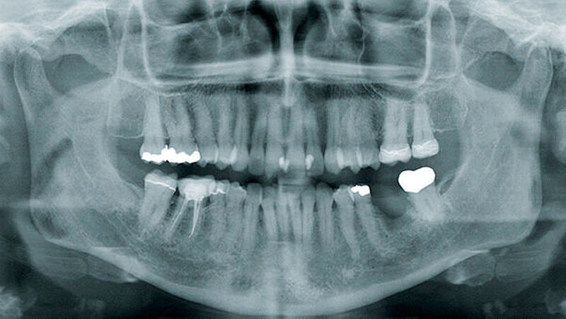 Die konventionelle Panoramaschichtaufnahme (PSA) hat als Ausgangsuntersuchung weiterhin einen großen klinischen Stellenwert (Abbildungen 1 und 3). Sie gibt einen ersten Überblick über Knochenstruktur und Zahnstatus. Ihre Aussagekraft ist jedoch aufgrund von Überlagerungseffekten limitiert [Strobel et al., 2012]. Darüber hinaus ist sie nicht sehr sensitiv, da erst ab einem Knochensubstanzverlust von etwa 30 bis 50 Prozent eine Osteolyse im Röntgenbild erkennbar ist.