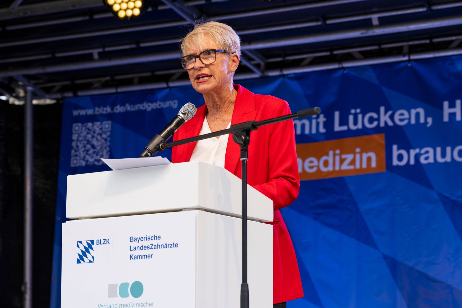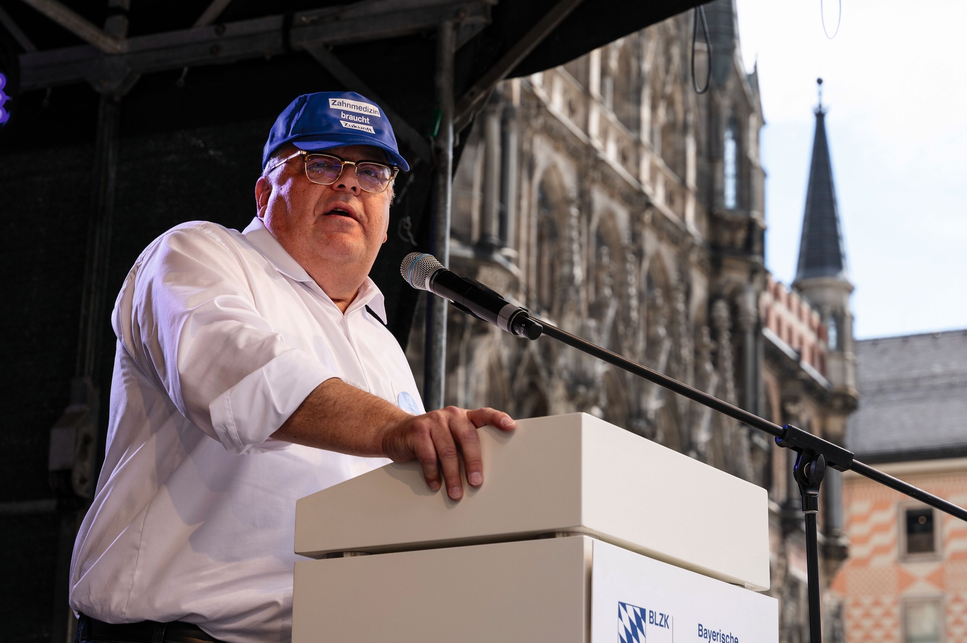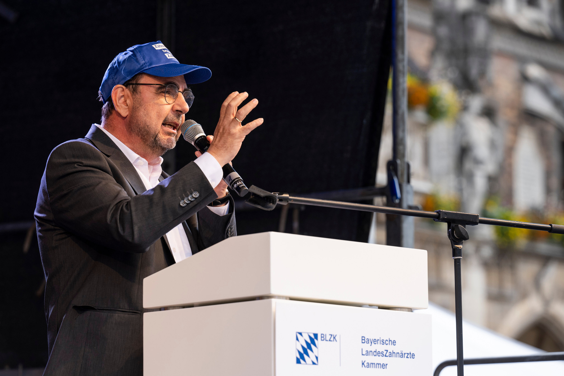 BLZK-Präsident Dr. Dr. Frank Wohl betonte in der Eröffnungsrede die große Bedeutung der Protestaktion: „Die heutige Veranstaltung war dringend notwendig. Wir brauchen bessere Perspektiven für unsere zukünftige Arbeit und setzen uns für Bürokratieabbau, für die längst überfällige Anpassung der Gebührenordnung für Zahnärzte (GOZ) und gegen den Aufkauf von Praxen durch Finanzinvestoren ein. Unsere Patientinnen und Patienten sind die Leidtragenden, wenn für die Praxis am Ort kein Nachfolger in Sicht ist oder wenn der nächste Zahnarzttermin in weiter Ferne liegt, weil die Bürokratie zu viel Behandlungszeit verschlingt. Uns hat bislang immer ausgezeichnet, dass wir für eine moderne und wohnortnahe zahnmedizinische Versorgung der Bevölkerung in unserer bayerischen Heimat sorgen – das soll auch in Zukunft so bleiben!“
