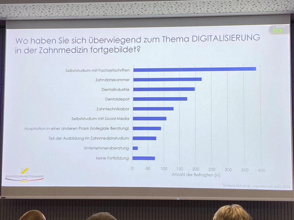 Bemerkenswert ist, dass die Einführung digitaler Instrumente offensichtlich mit stark intrinsischem Interesse verbunden ist. Auf die Frage „Wo haben Sie sich überwiegend zum Thema Digitalisierung in der Zahnmedizin fortgebildet?“ gaben knapp 40 Prozent der Befragten das „Selbststudium mit Fachzeitschriften“ an. Auch die Informationen aus den Zahnärztekammern wurden von 22 Prozent gern zu Rate gezogen. Es folgten Angeboten der Dentalindustrie (20 Prozent) und aus Dentaldepots (17 Prozent).