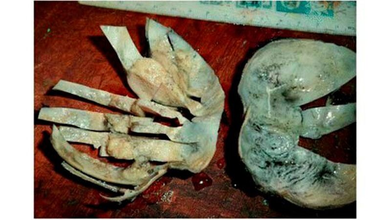 Bei der chirurgischen Entfernung wurde ein primäres Karzinosarkom identifiziert, das sich aus einem Teil der Zystenwand ergab. Auf der makroskopischen Darstellung erschien die Läsion gut eingekapselt ohne offensichtliche extrakapsuläre Invasionen.