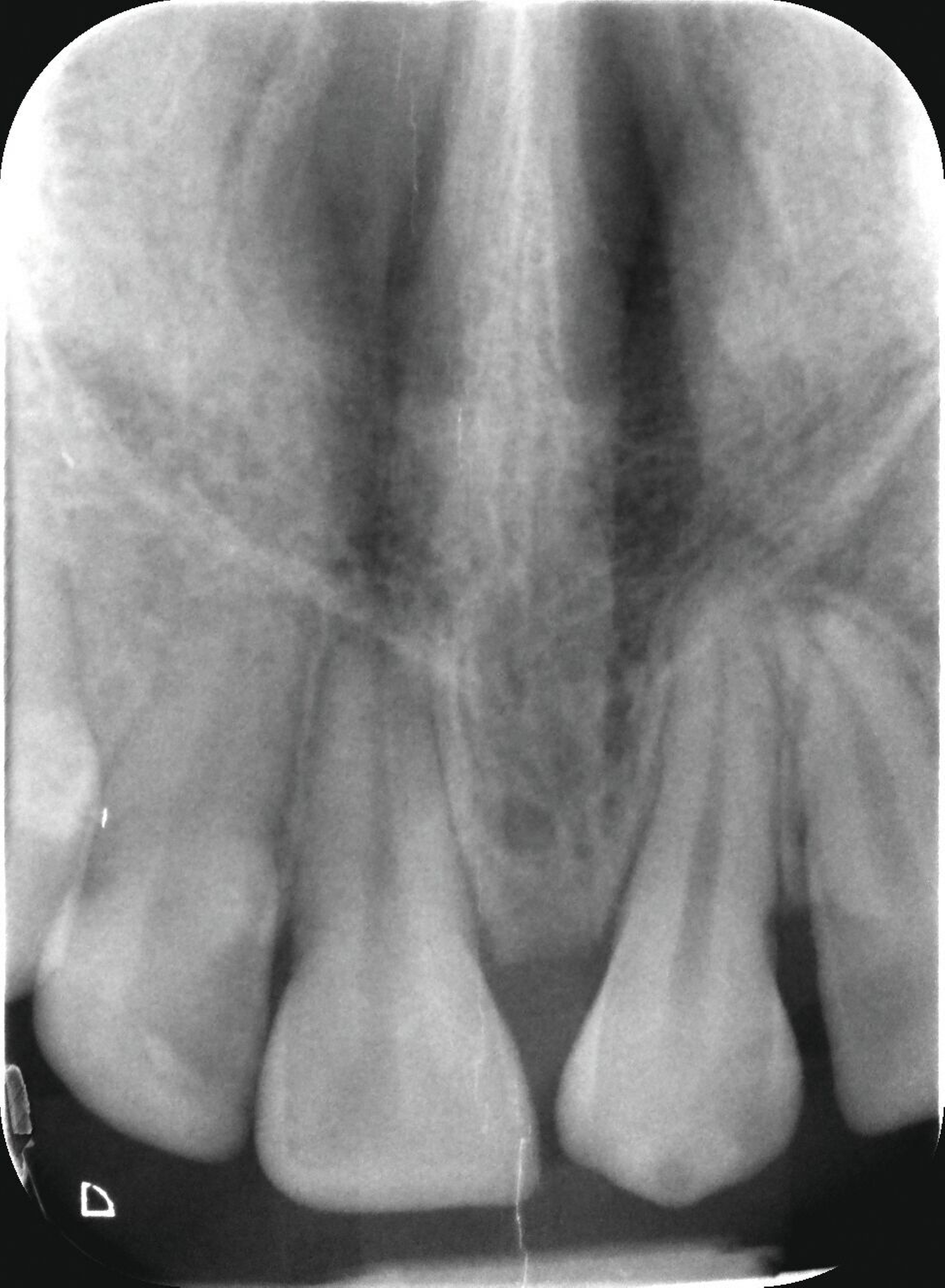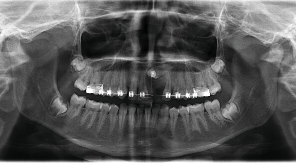 Um die Position des impaktierten Eckzahns zu beurteilen, wurde zehn Monate nach der Extraktion des Schneidezahns eine weitere Panoramaröntgenaufnahme angefertigt, Die Position des Eckzahns war unverändert, jedoch hatte die Extraktion des impaktierten oberen Schneidezahns zu einer signifikanten Knochenresorption und Atrophie des Alveolarkamms (Abbildung 3) geführt.