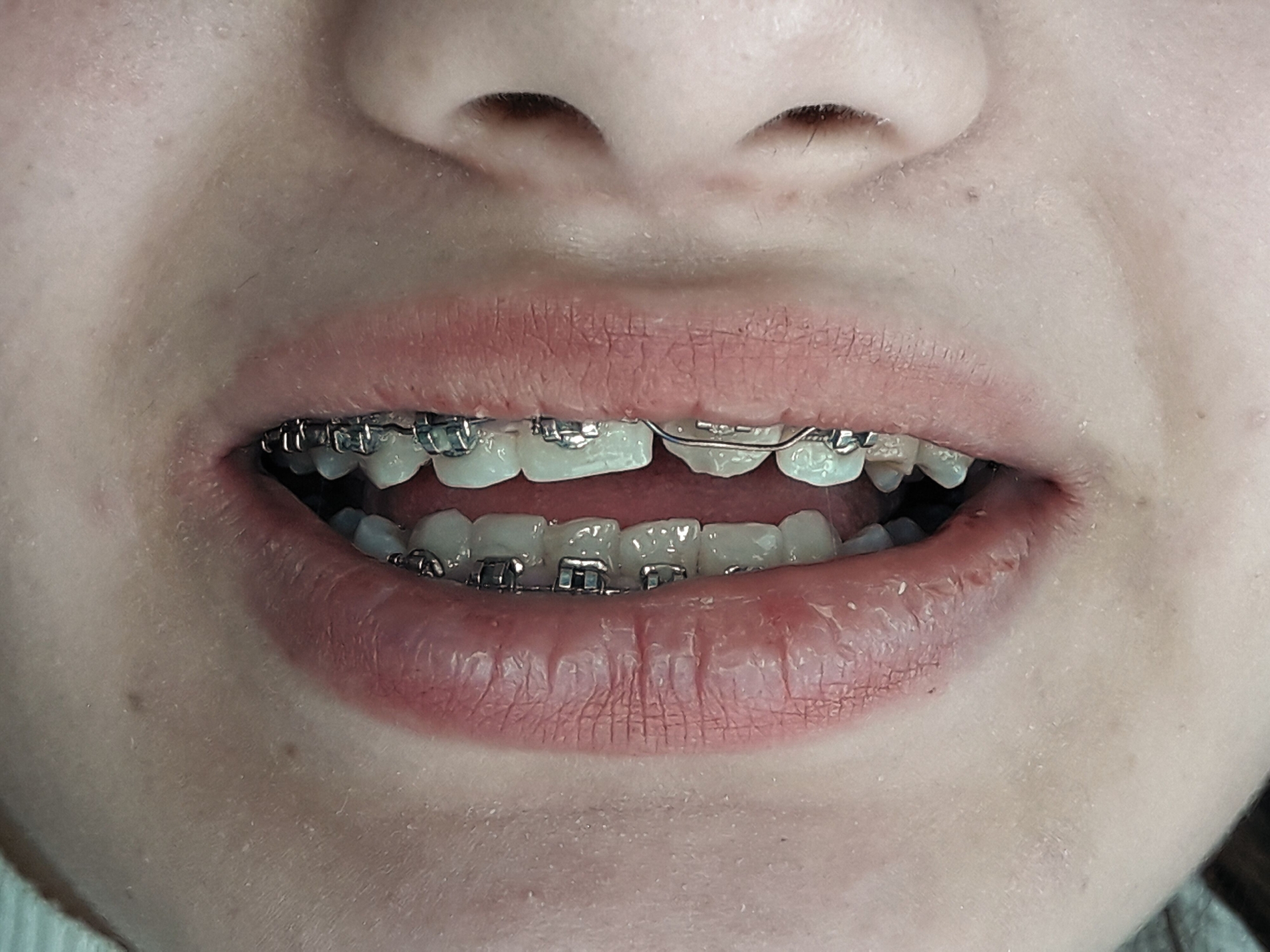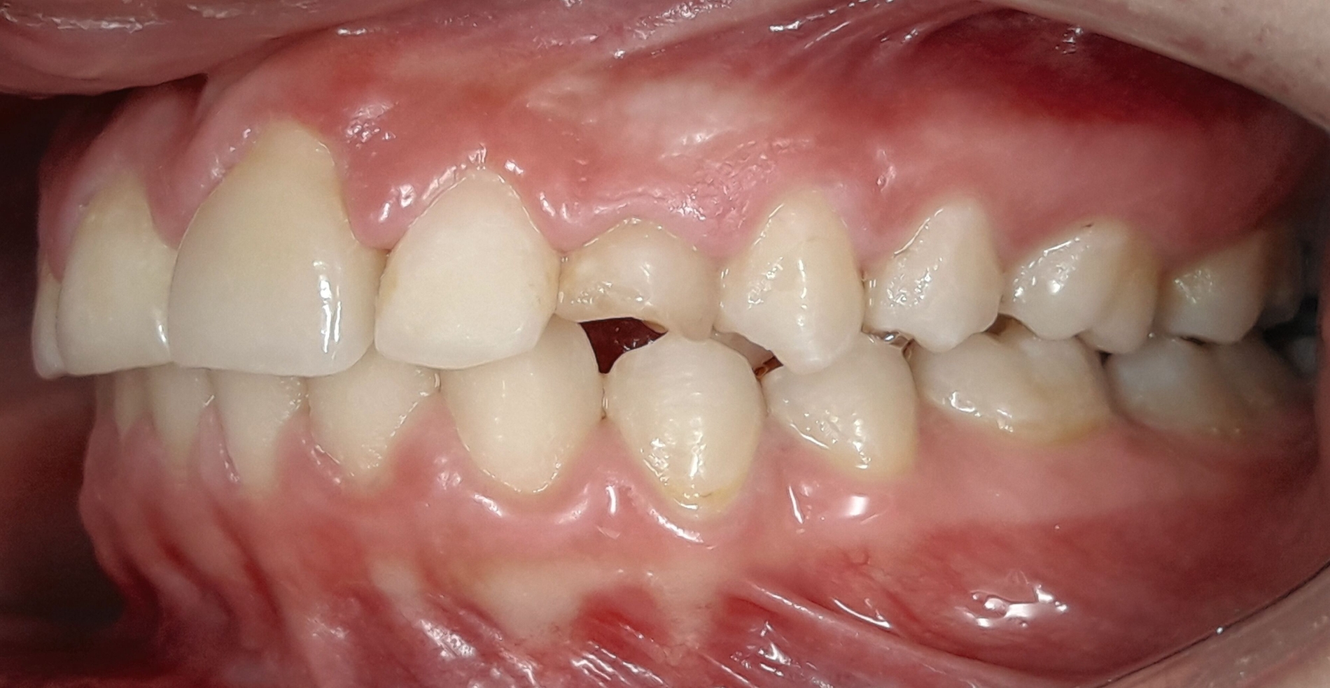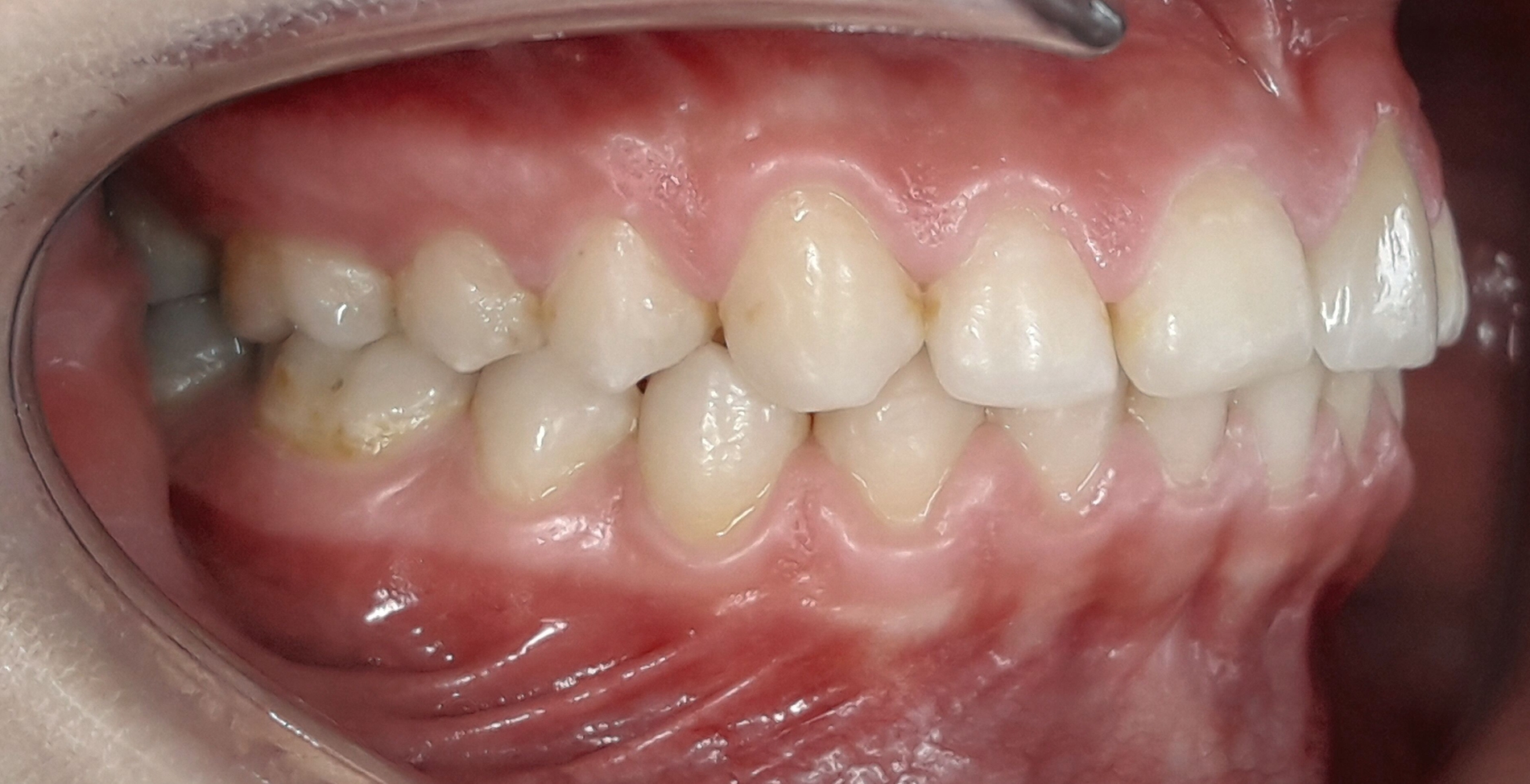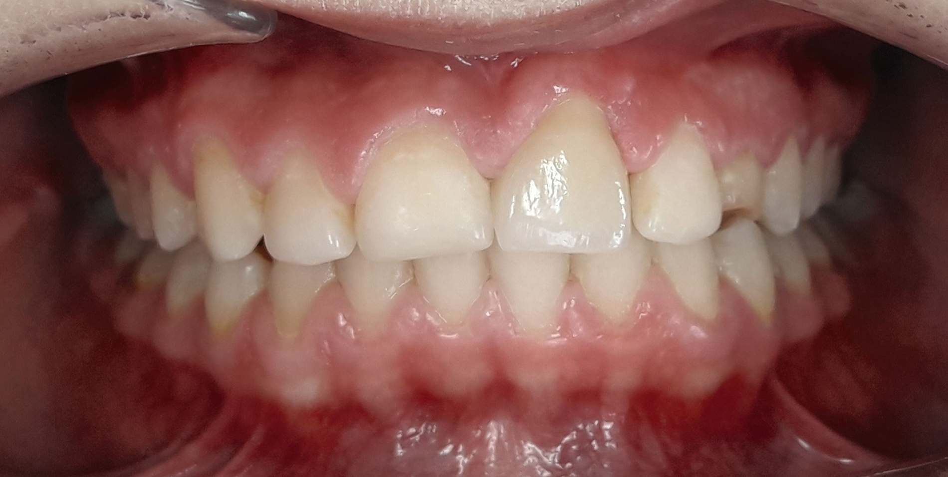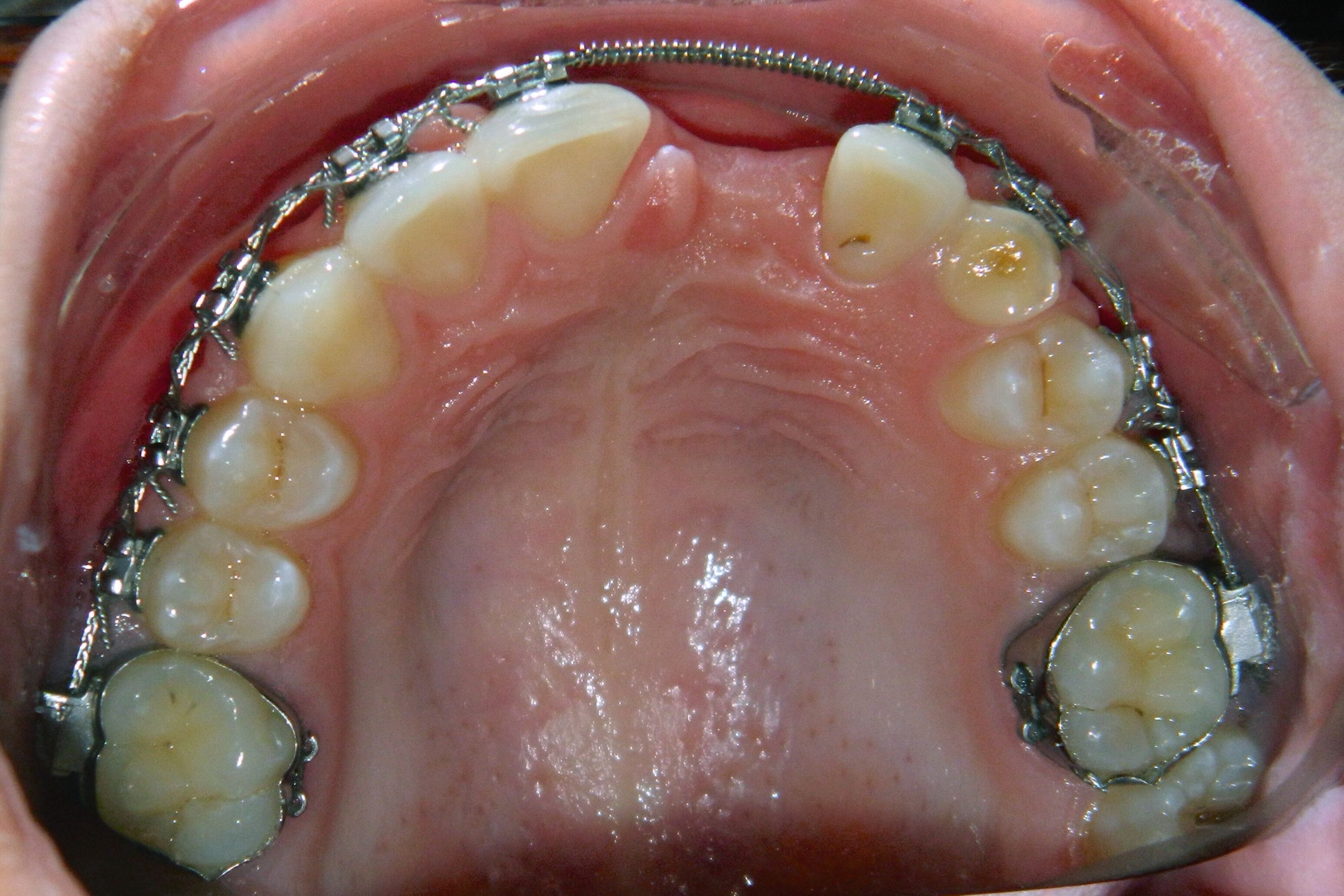 Trotz wiederholter Mundhygieneinstruktionen während der Behandlung war die Motivation der Patientin zur Verbesserung der Mundhygiene unzureichend, was zur vorzeitigen Entfernung der festsitzenden Apparatur führte (Abbildung 7). Deshalb konnten die Wurzelangulation und die Torque desEckzahns nicht wie geplant korrigiert werden. Eine zusätzliche Extrusion von zwei Millimetern wäre wünschenswert gewesen, um den Gingivarand in eine optimale Position zu bringen.