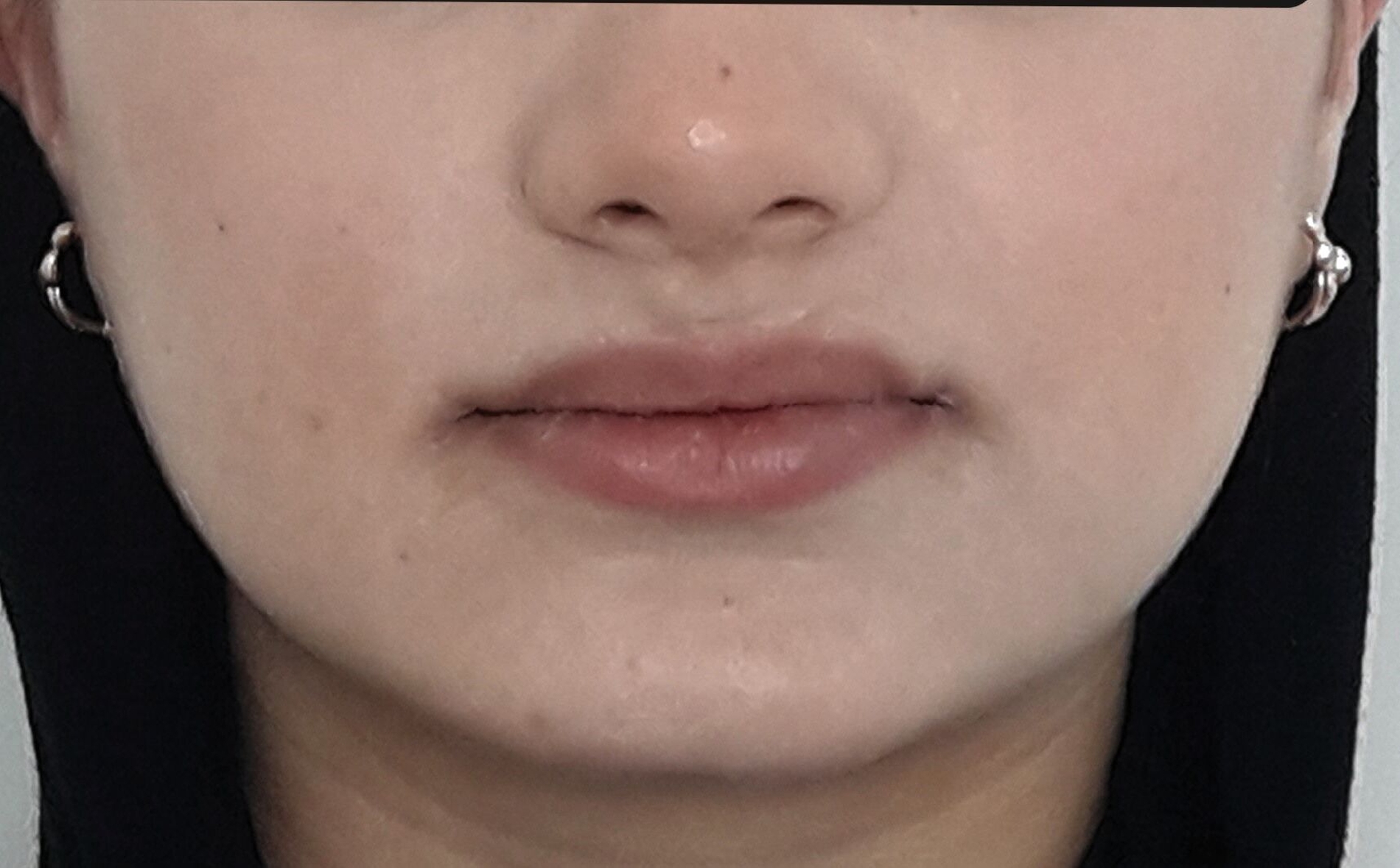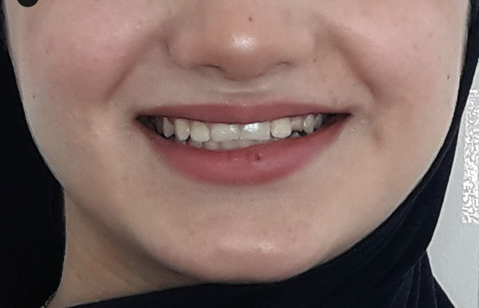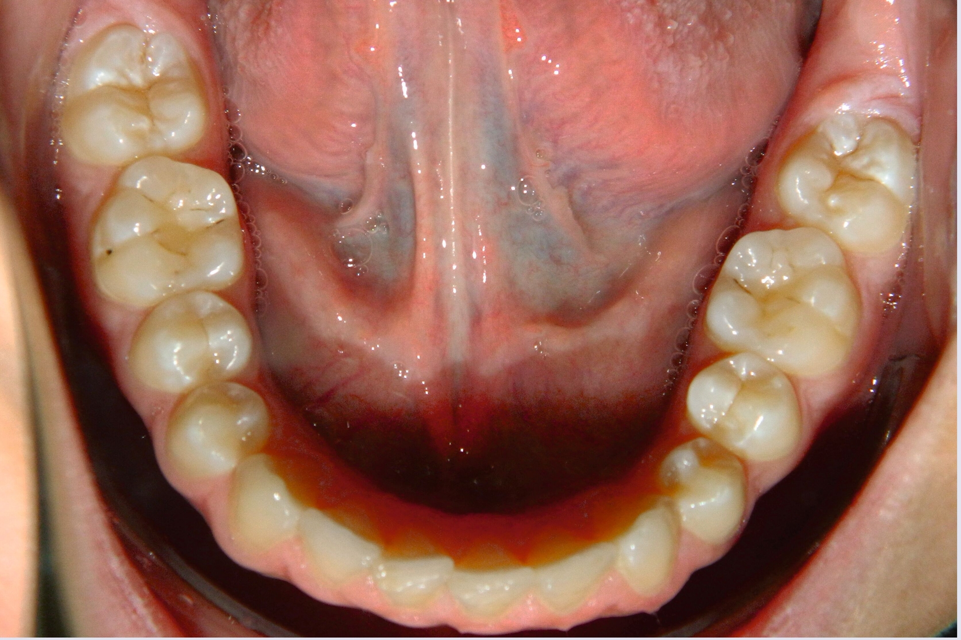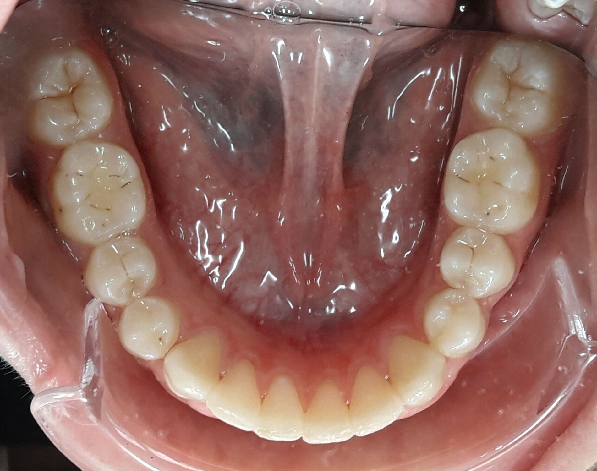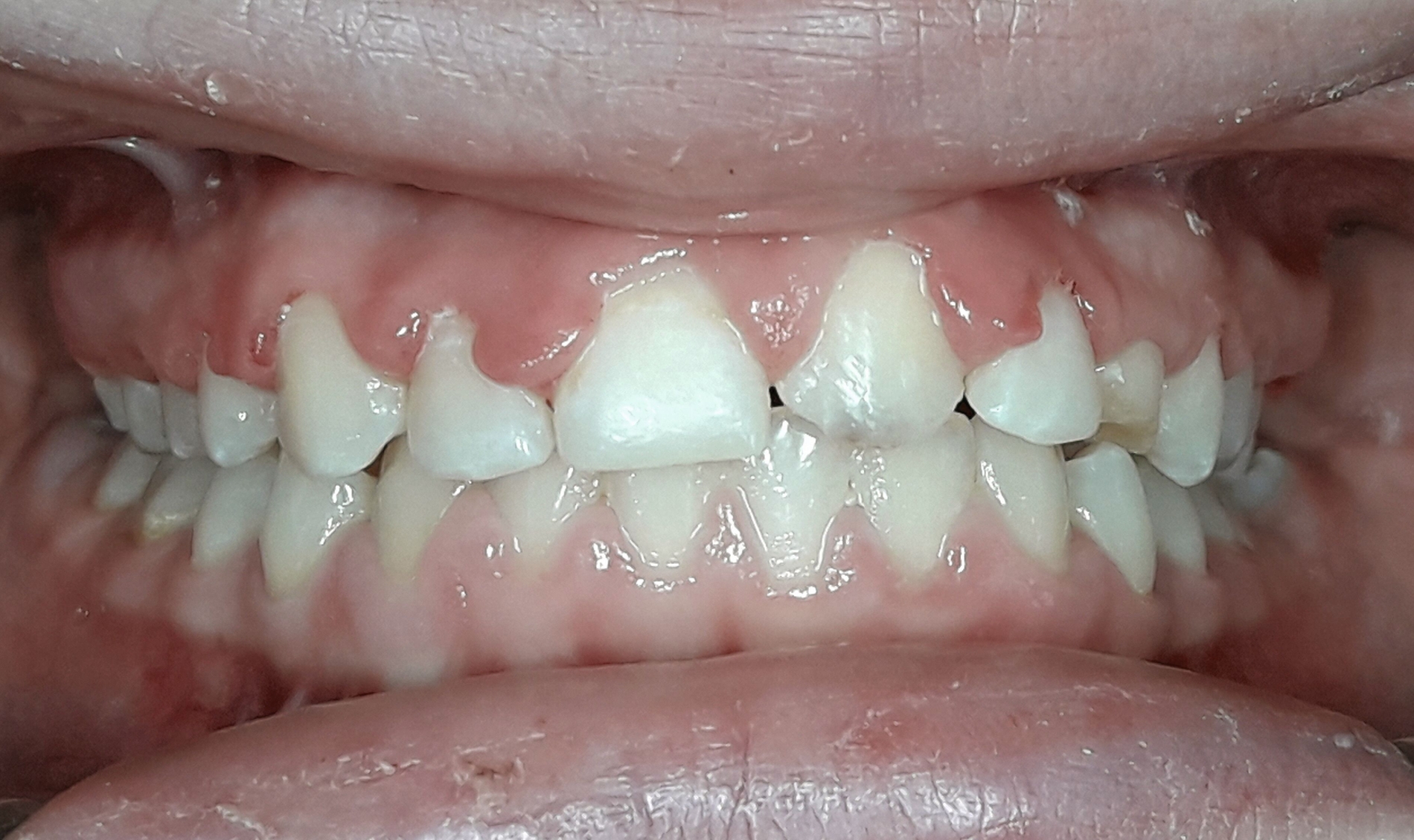 Trotz wiederholter Mundhygieneinstruktionen während der Behandlung war die Motivation der Patientin zur Verbesserung der Mundhygiene unzureichend, was zur vorzeitigen Entfernung der festsitzenden Apparatur führte (Abbildung 7). Deshalb konnten die Wurzelangulation und die Torque desEckzahns nicht wie geplant korrigiert werden. Eine zusätzliche Extrusion von zwei Millimetern wäre wünschenswert gewesen, um den Gingivarand in eine optimale Position zu bringen.