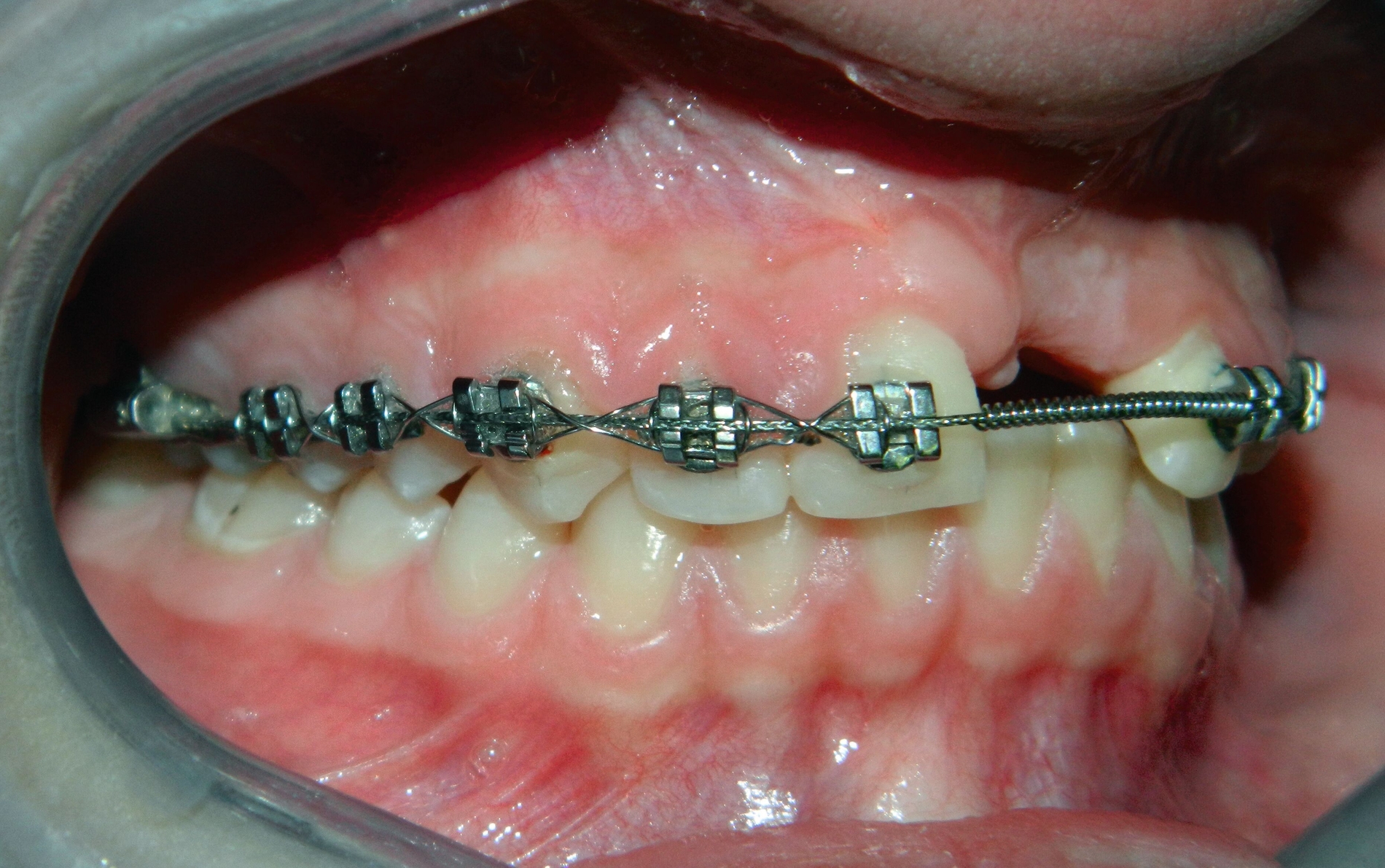 Die visuelle Beurteilung der Lage der Schneidezähne ergab, dass die Lippenlinie sehr niedrig war und diePatientin eine konkave Lachlinie aufwies. Deshalb wurde die „2 x 4-Segmentbogentechnik“ angewendet, um die Oberkieferfrontzähne zu extrudieren, die Exposition der Oberkieferschneidezähne zu erhöhen und die Lachlinie zu nivellieren (Abbildung 6).