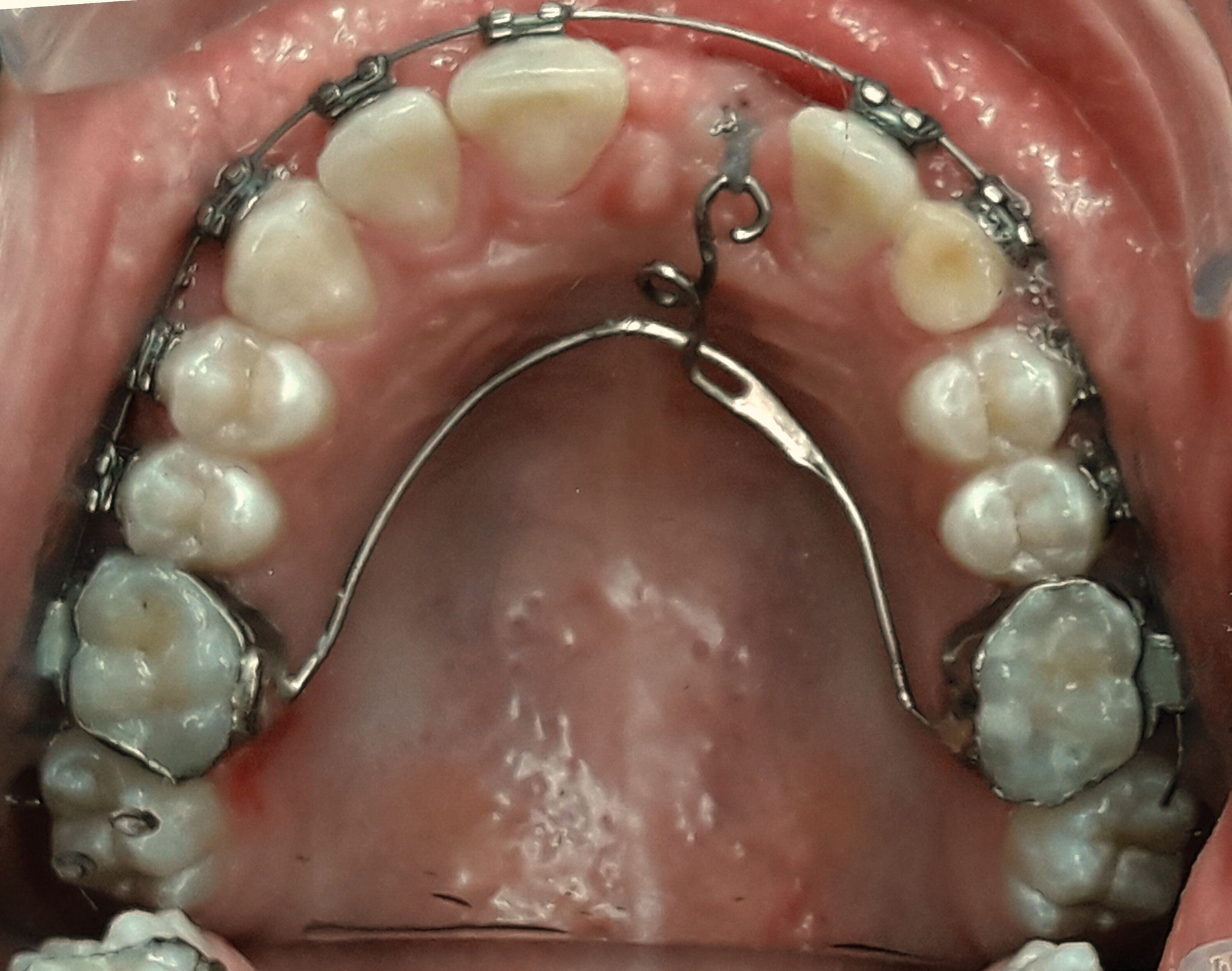 Drei Wochen nach der Operation wurde mithilfe eines modifizierten Palatinalbogens mit einem verlängerten Palatinalarm mit der Traktion des Eckzahns begonnen (Abbildung 4).