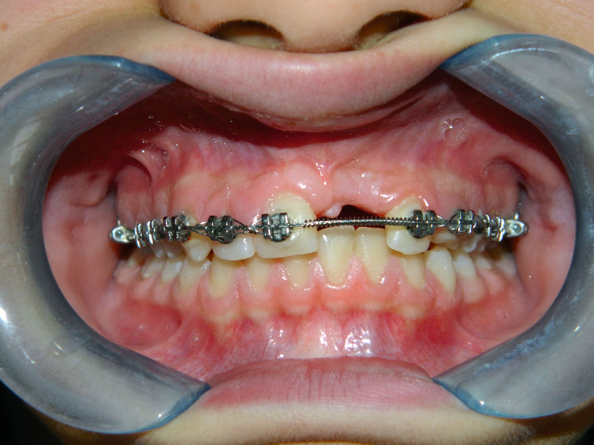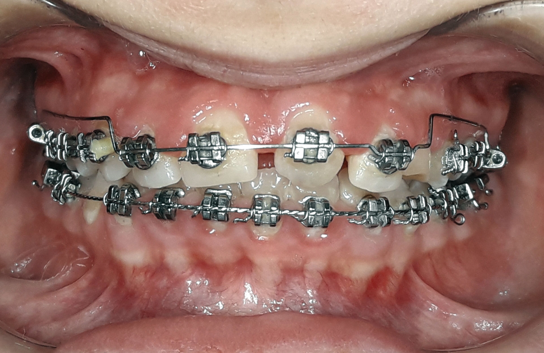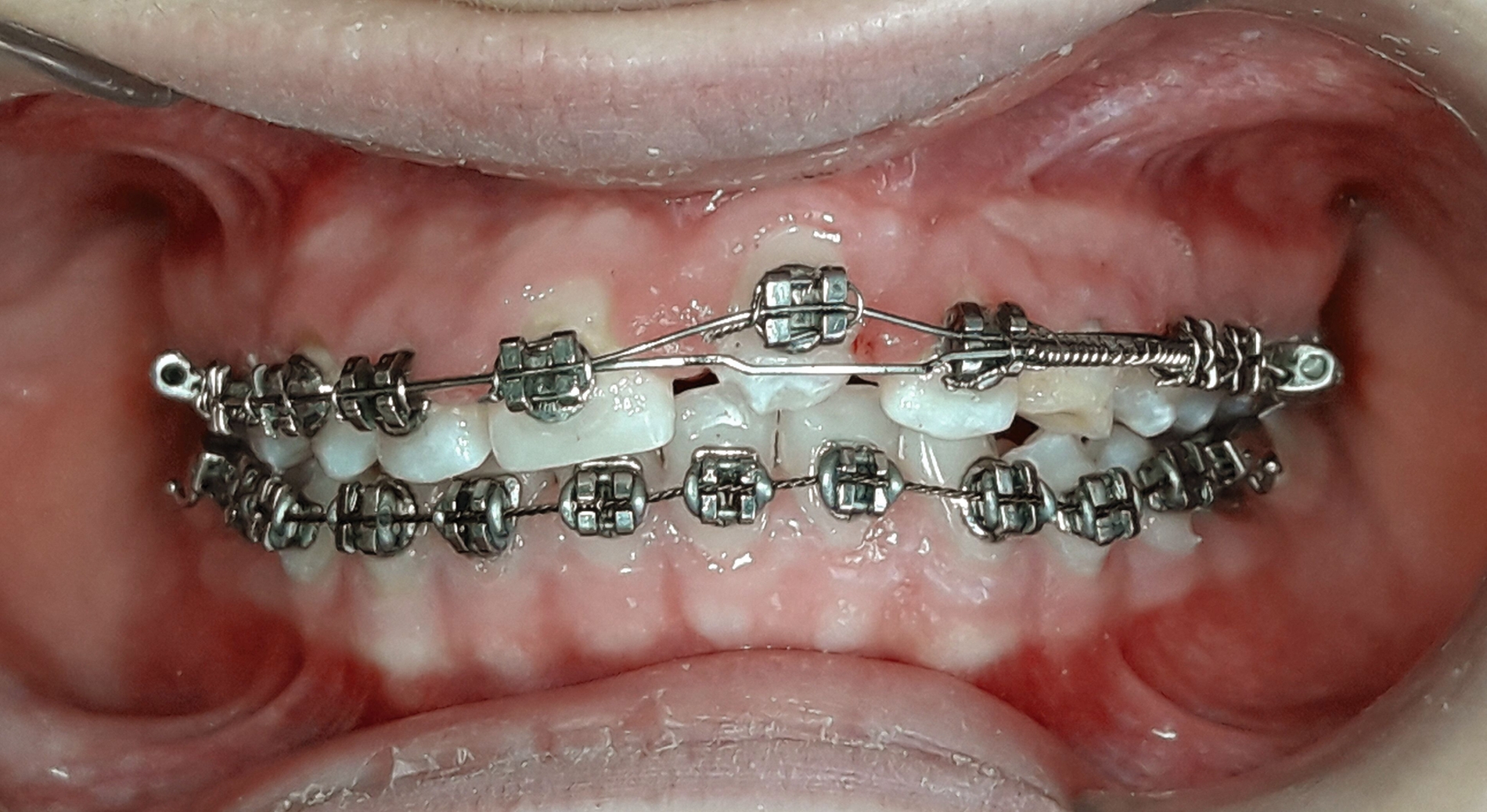 Im Februar 2019 wurde die kieferorthopädische Klinik von der Erstautorin übernommen. Bei der Auswertung der vorgefundenen Daten der Patientin wurde festgestellt, dass der linke obere zentrale Schneidezahn vor sechs Monaten extrahiert worden war. Die festsitzende Apparatur war im Oberkiefer bereits eingegliedert. Die Druckfeder zwischen Zahn 11 und 22 diente zur Lückenöffnung für den späteren prothetischen Ersatz des Zahnes 21. Auch auf den persistierenden linken Milcheckzahn war ein Bracket geklebt. Die Okklusion im Bereich der ersten Molaren war rechts und links neutral (Abbildung 2).