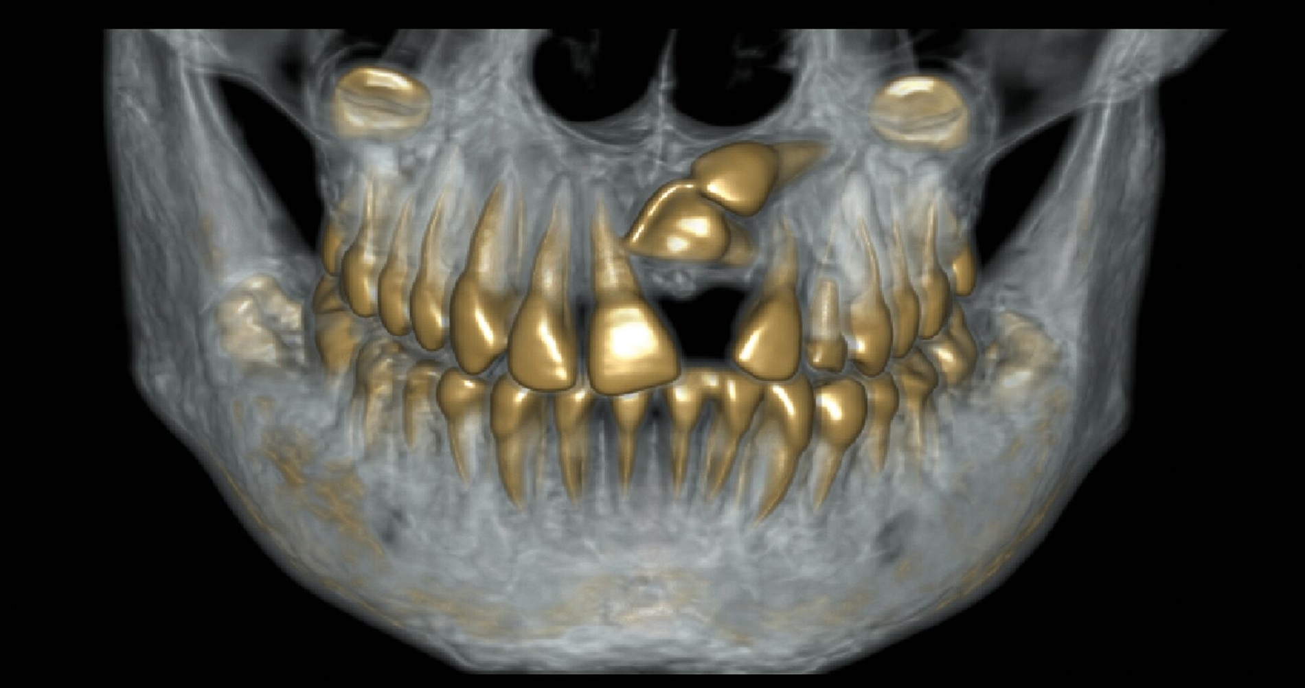 Die kieferorthopädische Behandlung der Patientin wurde im Mai 2018 (alio loco) begonnen. Zu diesem Zeitpunkt war die Patientin zehn Jahre alt. Bei der Erstellung des Behandlungsplans wurde der Fall initial als fehlender linker Eckzahn im Oberkiefer diagnostiziert. Vor der Extraktion des Schneidezahns wurde eine CT-Aufnahme durch den Erstbehandler angewiesen. Die Bildgebung ergab, dass der obere mittlere Schneidezahn sowie der Eckzahn auf der linken Seite betroffen waren (Abbildung 1). Die Patientin wurde daraufhin vom Erstbehandler zur Extraktion des impaktierten Zahnes 21 überwiesen.