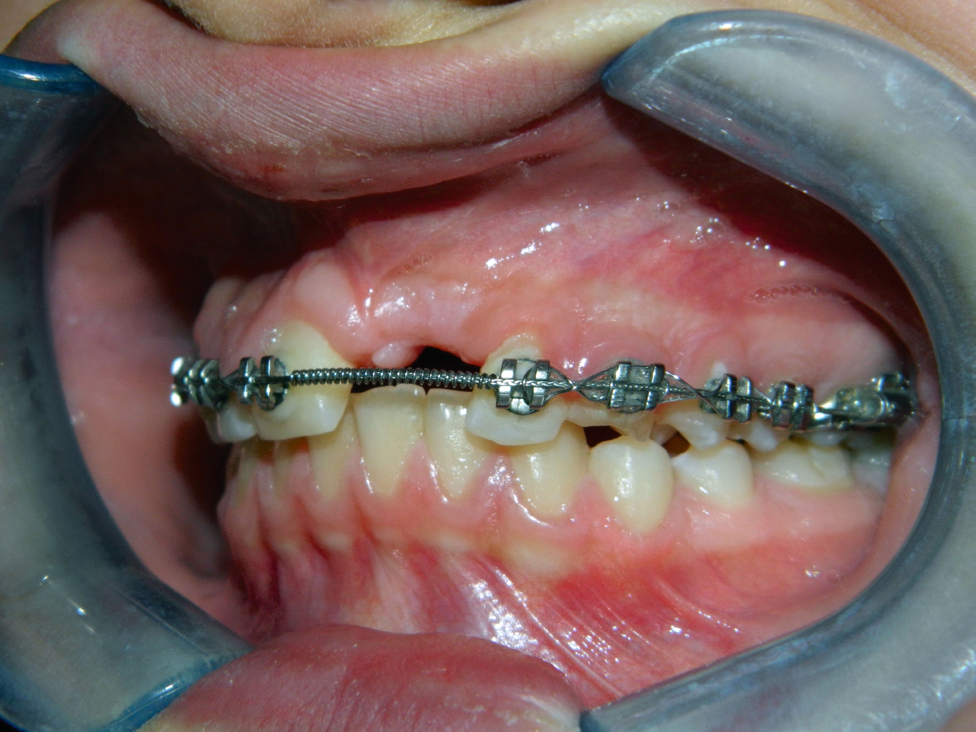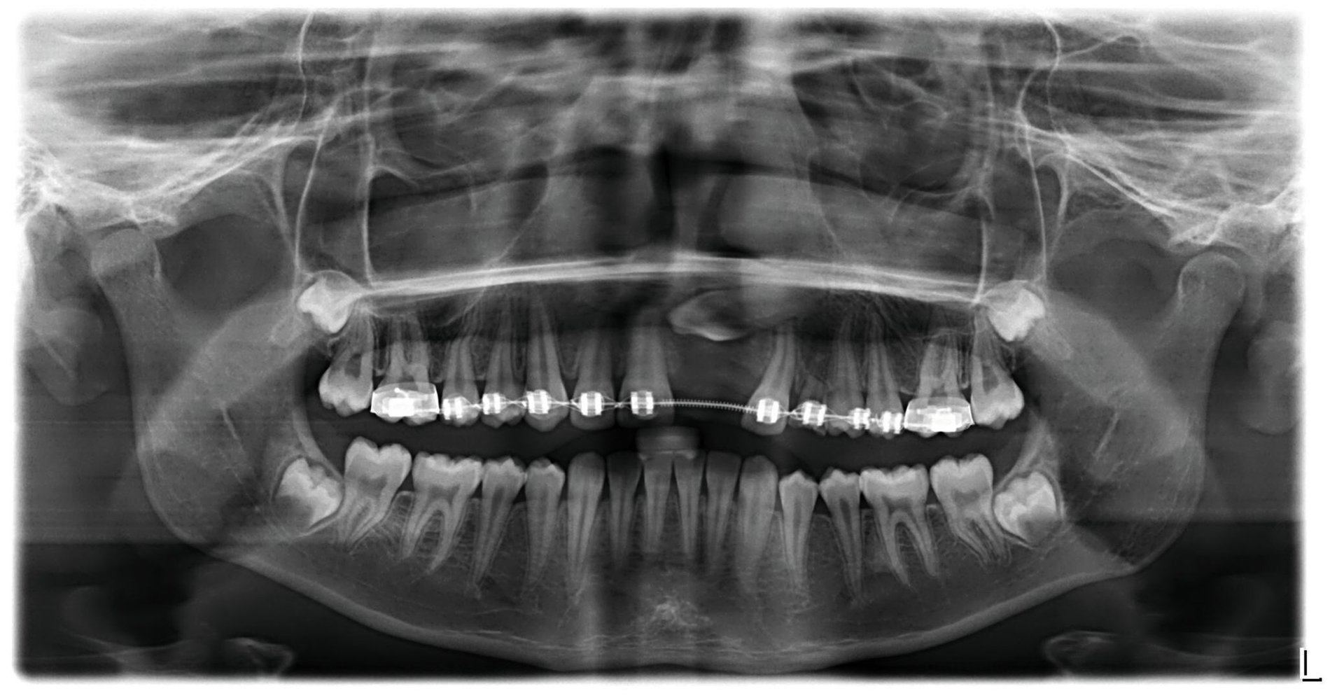 Das Bracket auf dem linken Milcheckzahn wurde entfernt, um einer weiteren Wurzelresorption und einem früheren Milchzahnverlust vorzubeugen, da dieser Zahn als Platzhalter belassen werden sollte. Des Weiteren war es von entscheidender Bedeutung, den Prozess der Atrophie des Alveolarkamms zu verhindern, um die spätere Insertion eines Implantats regio 23 zu ermöglichen.