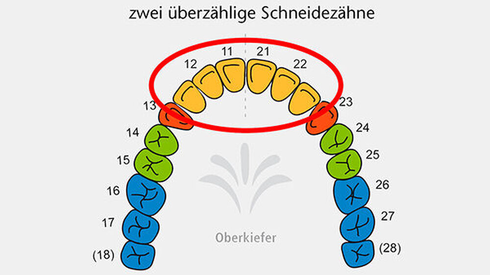 Diagnose: Die Ausgangssituation im oberen anterioren Segment war gekennzeichnet durch zwei überzählige mediale Schneidezähne, den ektopen Durchbruch der distal lokalisierten lateralen Schneidezähne und die enge Keimlage im Eckzahnbereich.