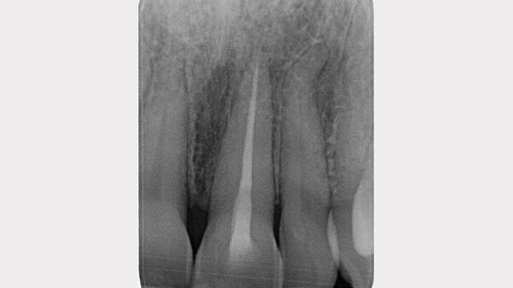 Vor der Fortsetzung der Wurzelkanalbehandlung an 21 war ein Zahnfilm indiziert, da der inzisale Referenzpunkt nach dem Aufbau verändert war. Temporärer Verschluss und Ledermix wurden entfernt. Das Wurzelkanalsystem erschien o.p.B.. Die elektronisch bestimmte Arbeitslänge wurde mittels Zielaufnahme bestätigt. Der fertig aufbereitete Wurzelkanal entsprach dieser in der Länge, umschloss den ursprünglichen Kanal und erhielt die apikale Konstriktion. In den getrockneten Kanal wurde Calciumhydroxid eingebracht und der Zahn temporär verschlossen.