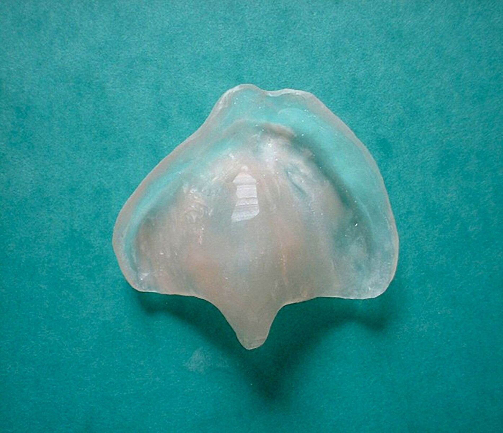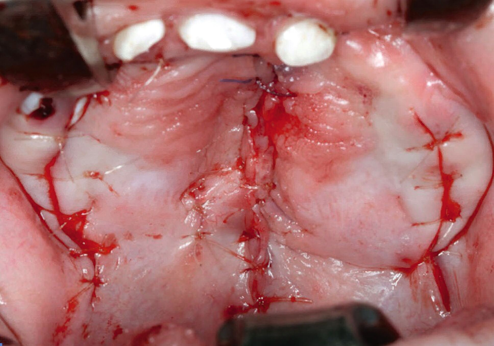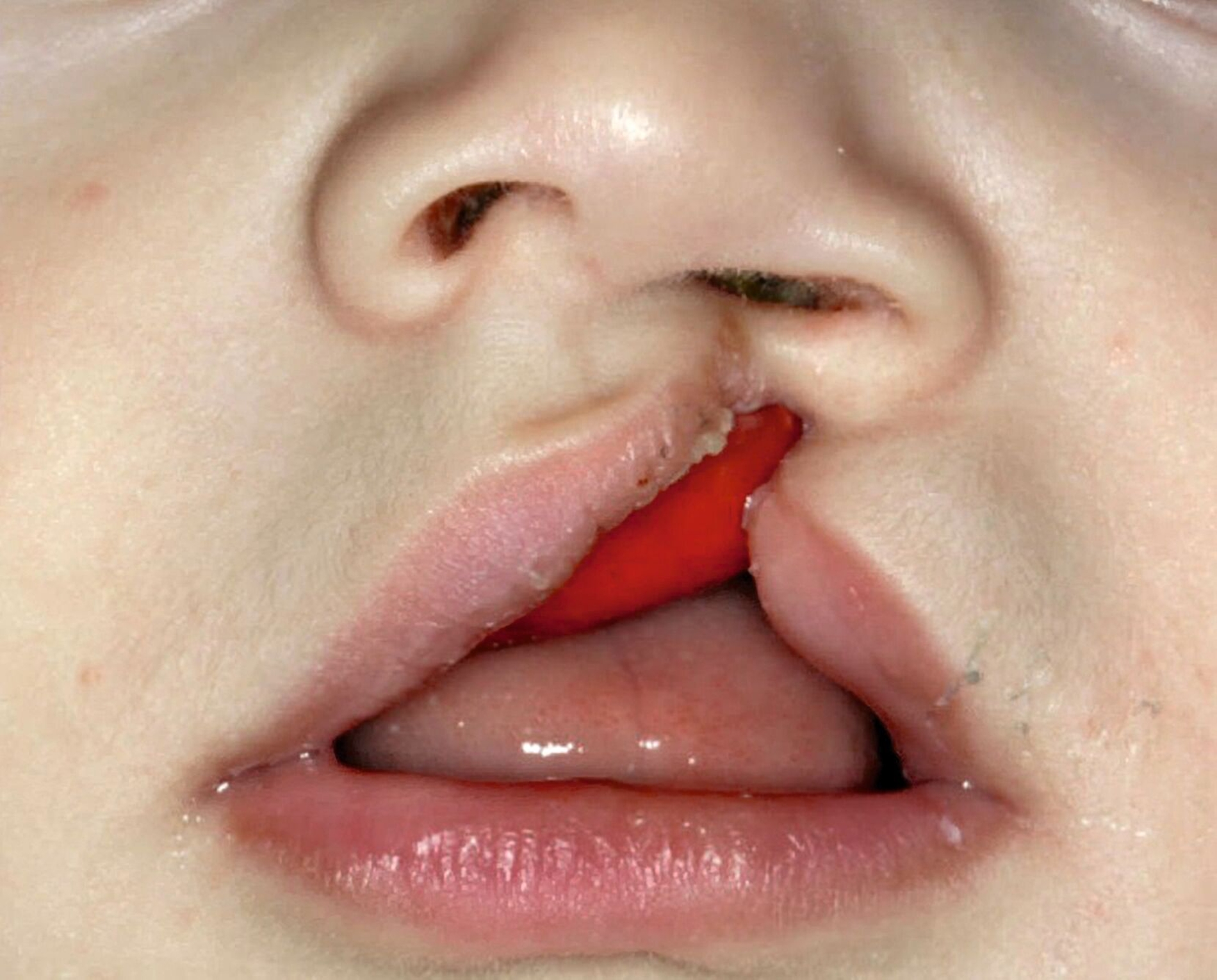 Chirurgische und kieferorthopädische Therapie sollten zur bestmöglichen Rehabilitation der orofazialen Funktionalität und Ästhetik in allen Entwicklungsphasen eng aufeinander abgestimmt sein. Die chirurgische Rekonstruktion von Oberlippe, Naseneingang, Nasenboden, Hart- und Weichgaumen erfolgt möglichst im ersten Lebensjahr (Abbildung 2). Die vorhergehende kieferorthopädische Therapie mittels Mund-Nasen-Trennplatte (Abbildungen 2, 3) zielt darauf ab, die Zungenruhelage zu korrigieren und somit bei durchgehenden Fehlbildungsformen das weitere Auseinanderdrängen der Segmente zu verhindern.