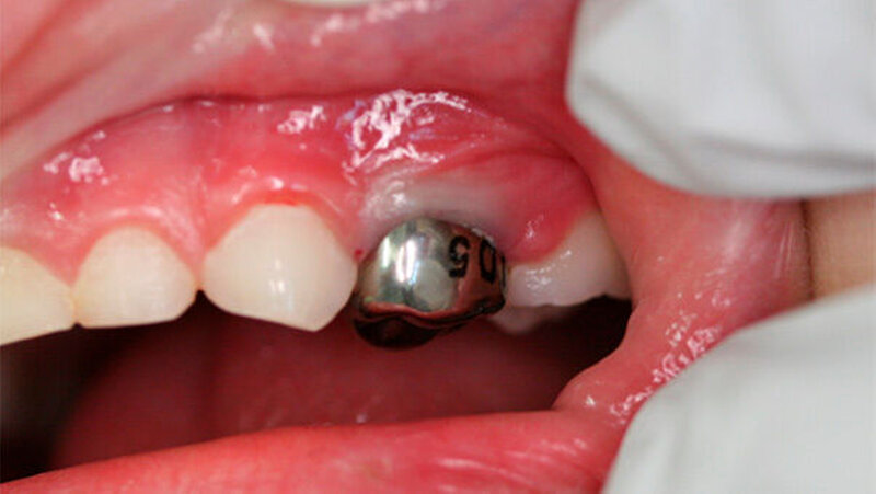 Für den Zahn wurde eine konfektionierte Stahlkrone (Größe 5) ausgewählt. Nach Reinigung des Zahnes wurde die konfektionierte Stahlkrone mit dünnfließendem Glasionomerzement zementiert. Dabei ist es wichtig dass die Krone den Zahn komplett bedeckt und die Ränder epi- bis leicht subgingival liegen (Abb. 2 a, b, c). Eine temporäre Bisserhöhung von circa zwei Millimetern ist häufig und korrigiert sich wie in diesem Fall in den ersten Wochen nach Applikation der Krone wieder vollständig [Van der Zee & van Amerongen, 2010].