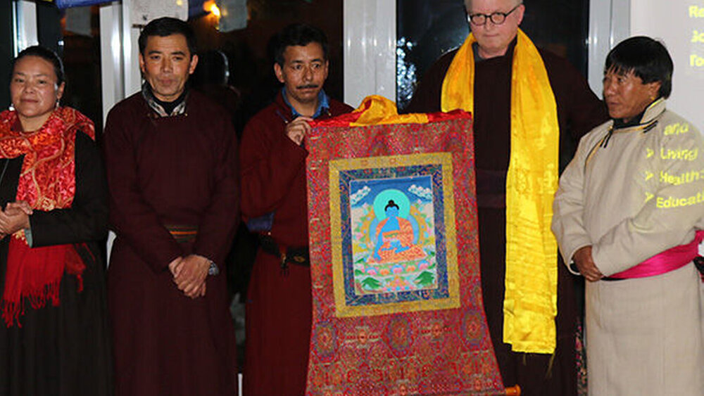 Zum Jubiläum gratulierte der Landrat der Region, Sonam Dorjay, und bedankte sich für die 15-jährige Projektarbeit. Er überreichte dem Initiator der Himalayahilfe, Maik Wieczorrek, einen gelben Katakh, ein Begrüßungsschal aus Seide, sowie einen "Thangka", dabei handelt es sich um ein buddhistisches Rollbild.