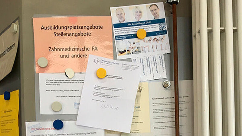 Die Empfehlungen dieses Beitrags basieren auf einem Gespräch mit der Leitung des Rahel-Hirsch- Oberstufenzentrums Gesundheit/Medizin in Berlin-Hellersdorf. In der Berufsschule werden im Rahmen der dualen Ausbildung über 1.000 angehende ZFA unterrichtet, die in Berliner Zahnarztpraxen ausgebildet werden. Es werden dringend Zahnarztpraxen gesucht, in denen Jugendlichen, die aus dem Ausland nach Berlin geflüchtet sind und am Oberstufenzentrum auf den Beruf vorbereitet werden, ihre Lehre absolvieren können.