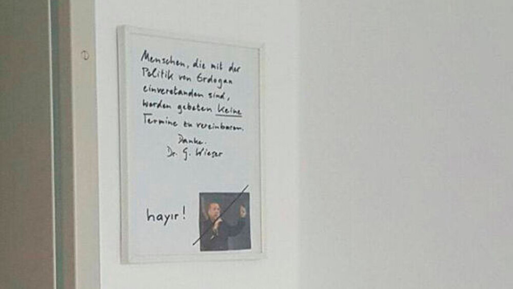 Ein Zahnarzt aus Innsbruck hat seine Meinung zu den Erdogan-Wählern geäußert: „Menschen, die mit der Politik von Erdogan einverstanden sind, werden gebeten, keine Termine zu vereinbaren“, ließ Dr. W. per Aushang in seiner Praxis ausrichten. Daneben befindet sich ein Bild des türkischen Staatsoberhauptes, das mit schwarzem Edding durchgestrichen wurde sowie das türkische Wort „hayir!“, was übersetzt "nein" bedeutet.