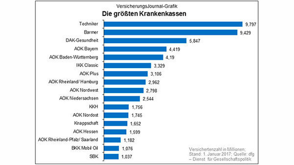 Dahinter kommen die AOK Bayern und die AOK Baden Württemberg (jeweils über 4 Millionen Versicherte). Auf den Plätzen sechs und sieben sind die IKK Classic und die AOK Plus mit jeweils 3 Millionen Versicherten, gefolgt von der AOK Rheinland-Hamburg mit knapp unter 3 Millionen Versicherten. Die Top Ten werden komplettiert von der AOK Nordwest und der AOK Niedersachsen, die auf jeweils über 2,5 Millionen Versicherte kommen.