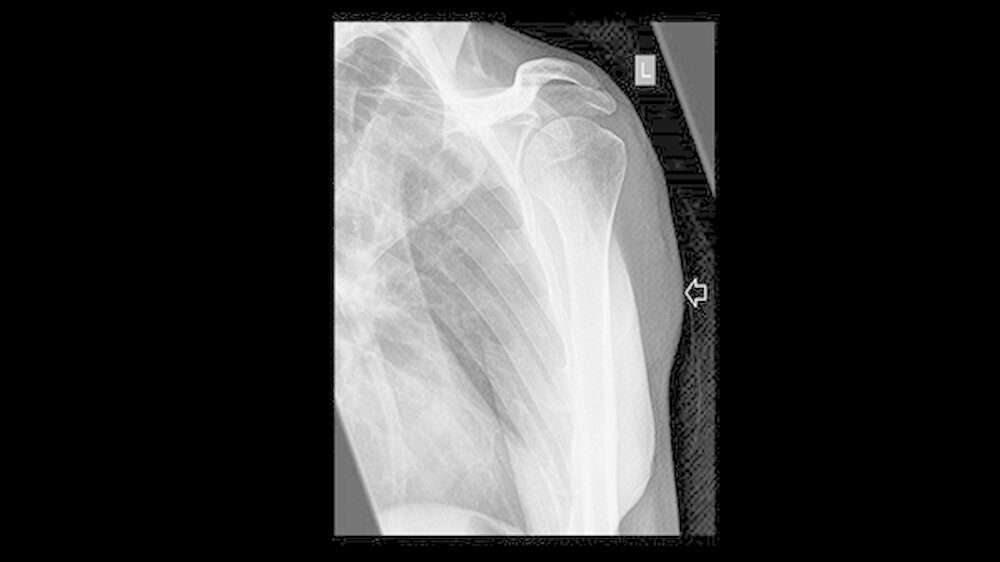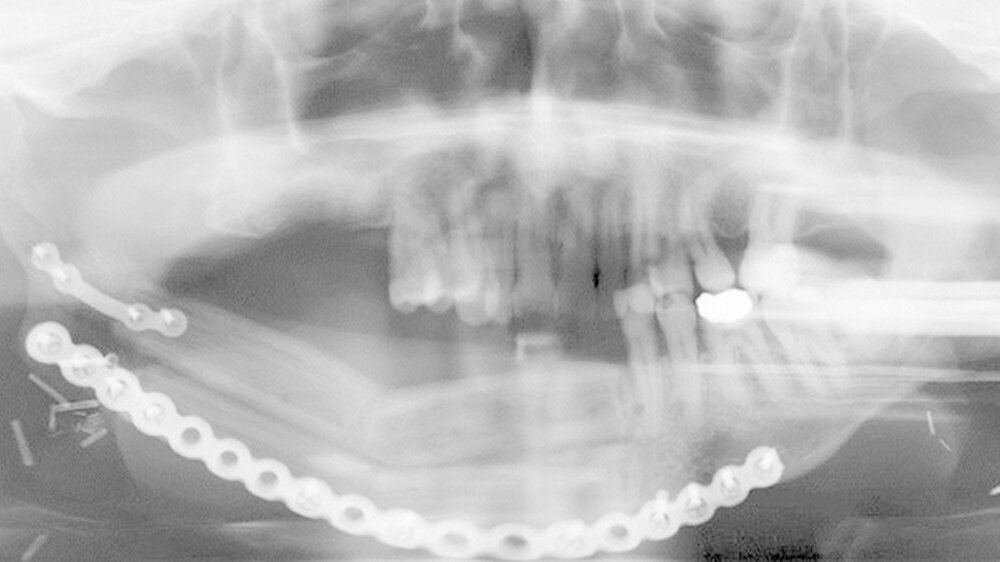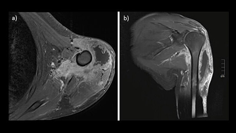 Ein Jahr nach der Exzision des Primärtumors, der begleitenden Radiatio sowie dem mikrochirurgischenAufbau des Unterkieferdefekts stellte sich der Patient erneut vor, um einen Termin zur Entfernung des Osteosynthesematerials zu vereinbaren. Bei dieser Untersuchung bemerkten die Chirurgen eine erhebliche Raumforderung am linken Oberarm, die nach Angaben des Patienten sehr schnellem Wachstum.