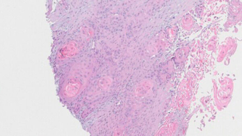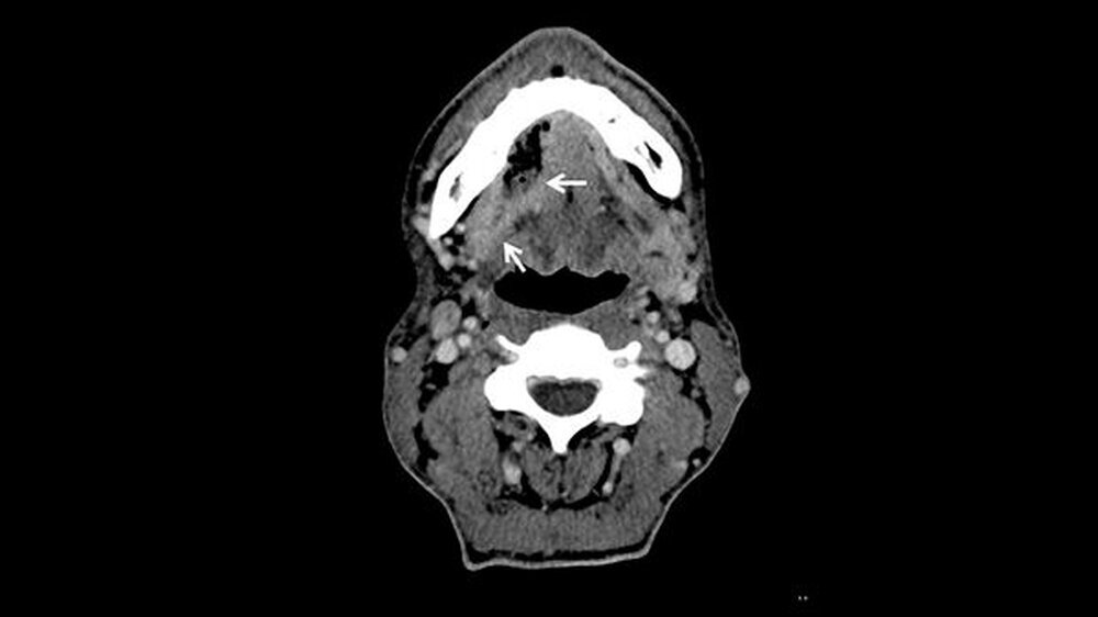 Weder das Röntgenbild noch die weitere Untersuchung mit magnetresonanztomografischer Bildgebung gaben eindeutigen Aufschluss. Daraufhin wurde eine Biopsie veranlasst, die die Verdachtsdiagnose einer Metastase des oralen Plattenepithelkarzinoms histologisch bestätigte.