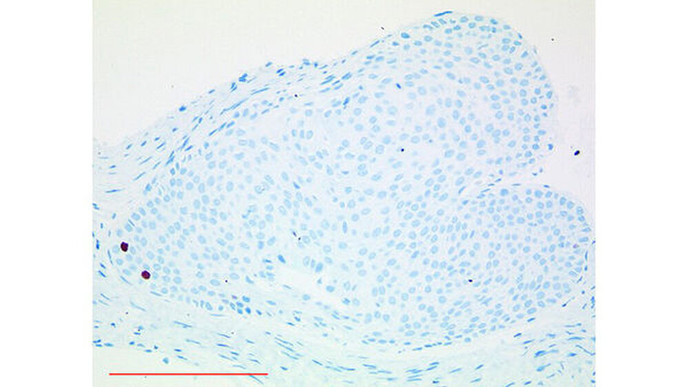 Die histologischen Auswertungen offenbarten Teile eines sklerotischen Stromas mit einem mehrschichtigen Epithel, in anderen Segmenten zeigte sich eine cylindroepitheliale Differenzierung. Außerdem fanden sich Segmente mit zystischer Struktur. Zahlreiche Abschnitte bestanden aus quaderförmigen Epithelzellen. Die zweite Probe zeigte ein kleines Zementom.