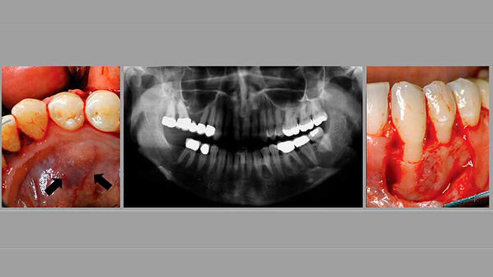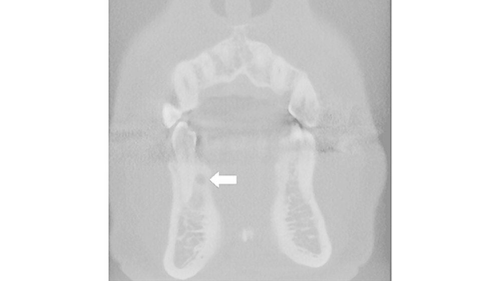 Eine 41-jährige Frau stellt sich im Dezember 2006 bei ihrem Zahnarzt vor und klagt über eine empfindliche Stelle mit leichten Druckbeschwerden im Prämolarenbereich des linken Unterkiefers. Die Panorama-Röntgenaufnahme zeigte keine sichtbaren Veränderungen am Knochen. Die Patientin erscheint jedoch schon nach kurzer Zeit wieder in der Praxis - mit denselben Beschwerden. Auf einem jetzt angefertigten Zahnfilm fällt eine radiopake Läsion zwischen den Wurzeln der Zähne 33 und 34 auf.