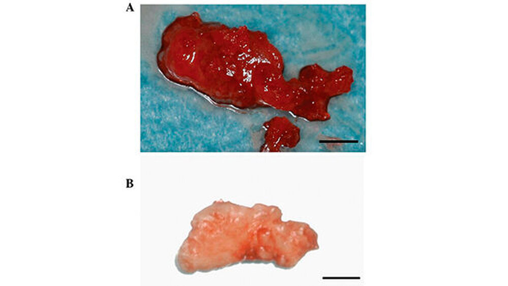 Ein zweiter chirurgisches Eingriff ergab, dass der rezidivierende intraradikuläre Tumor kleiner war und sich die Läsion nicht bis zu den Wurzelspitzen erstreckte. Die OP wurde unter örtlicher Betäubung durchgeführt. Zwei Gewebestücke wurden von vestibulär durch Kürettage gewonnen, aus dem wiederkehrenden Tumor (Fig. 5A) eine als kleines Zementom-artiges Gewebe (Fig. 5B). Der Hohlraum wurde anschließend mit einem Kollagenschwamm TissuFleece E aufgefüllt. Der vestibuläre Defekt wurde mit einer BioGide Membran abgedeckt.