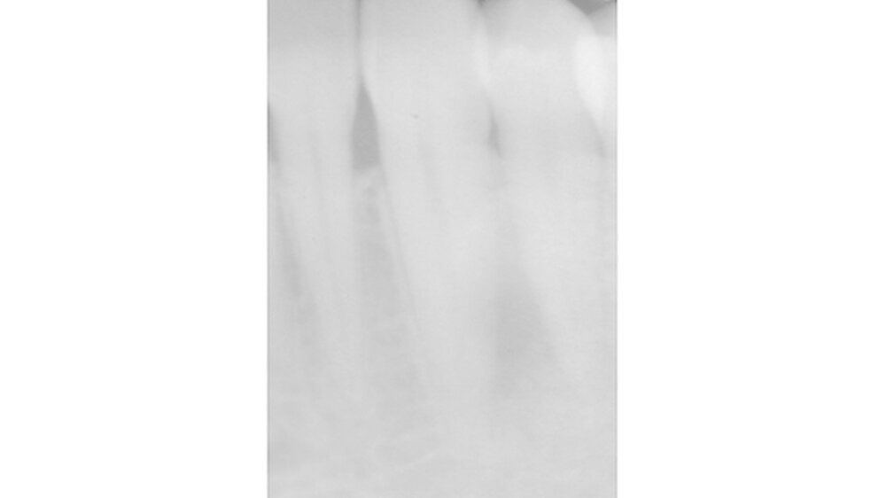 Die Patientin hatte keine Schmerzen. Ihre bisherige Krankengeschichte war unauffällig; es wurden zuvor keine Tumore diagnostiziert, und die Frau war niemals operiert worden. Die betreffenden Zähne waren auf Kältetest sensibel, auch die benachbarten Zähne waren gesund.