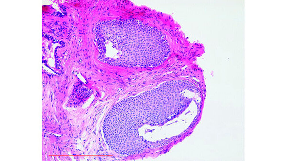 Die Patientin erhielt zusätzlich über eine Woche dreimal täglich oral Phenoxymethylpenicillin (Penicillin V 1,5 Mega). Mit der histopathologischen Abklärung anhand einer Probe konnten Überreste einer zystischen Läsion mit einem mehrschichtigen Plattenepithel nachgewiesen werden. In weiten Bereichen der Randschicht zeigte sich eine zylindroepitheliale Konfiguration mit adenoiden Segmenten. Kleinere Abschnitte enthielten zwei bis drei Lagen mit Verkalkungen (Fig. 2 und und 3). Die Diagnose eines Squamous odontogenic tumors (SOT) wurde dann vom Knochentumor-Referenzzentrum am Institut für Pathologie des Universitätsspitals Basel bestätigt.