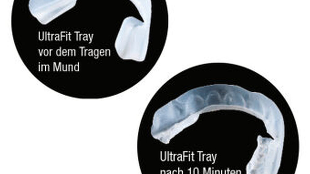 Die vorgefertigten, gebrauchsfertigen UltraFit Trays sind bereits mit einem 6%igen H2O2-Gel befüllt. Die Folie des Innentrays auf der Zahnreihe formt sich nach wenigen Minuten ideal an, bleibt während der 60-90minütigen Tragezeit formstabil und sitzt sicher und komfortabel. Bereits nach wenigen Anwendungen sind Aufhellungs-Erfolge zu sehen. Als beliebte Aromen stehen Mint oder Melone zur Auswahl.