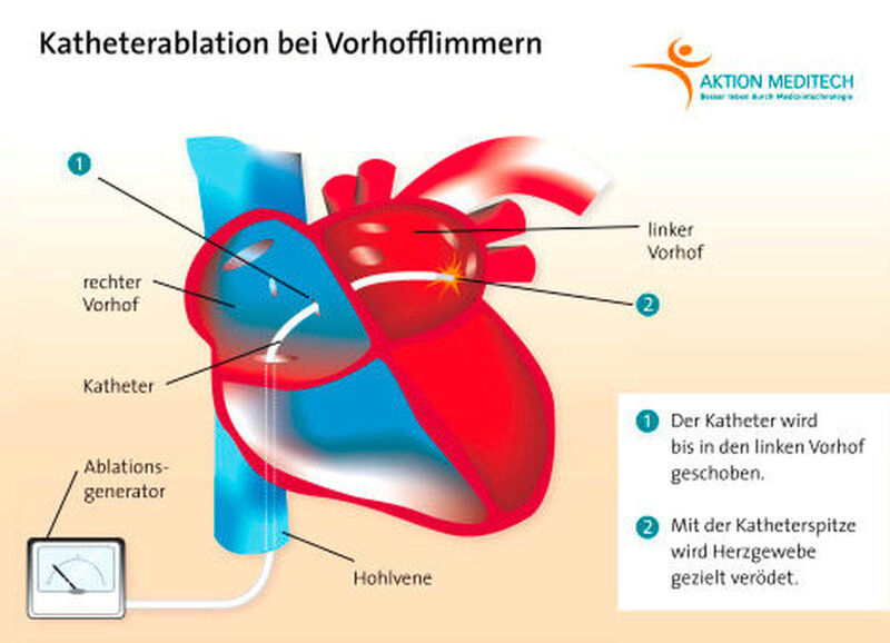 Bleibt die elektrische Kardioversion ohne den erwarteten Erfolg oder kommt es zum VHF-Rezidiv, so ist eine Katheterablation zu erwägen. Dabei werden spezielle Bereiche im linken Vorhof verödet und die kreisenden Erregungen durchbrochen. Konkret werden, so die Erklärungen des AFNET, mithilfe eines Spezialkatheters im Rahmen einer elektrophysiologischen Untersuchung verschiedene Orte auf der Herzinnenseite, die für die Rhythmusstörungen verantwortlich sind, aufgesucht. Durch Hochfrequenzstrom wird die zwei bis vier Millimeter lange Metallspitze des Katheters erhitzt, so dass es an den Stellen im Herzgewebe, die von dieser Spitze berührt werden, zu punktförmigen Verödungsnarben kommt. Durch das Aneinanderreihen vieler kleiner Verödungspunkte werden sogenannte lineare Läsionen angelegt, die die Ausbreitung der elektrischen Impulse einschränken.