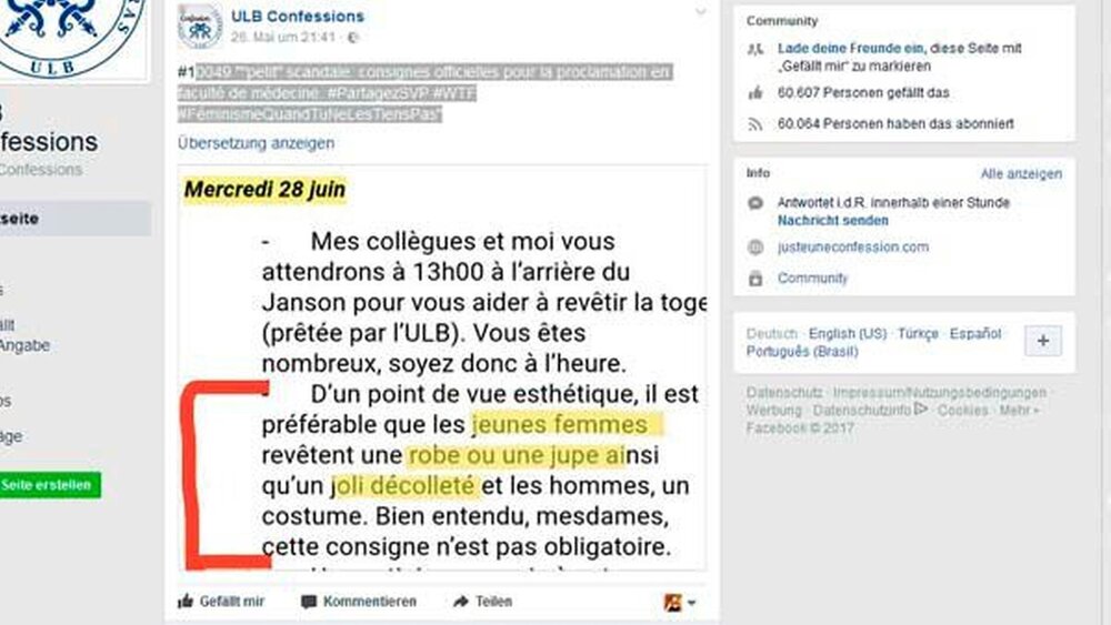 Die Université libre de Bruxelles (ULB) legte Medizinstudentinnen per E-Mail nahe, dekolletiert auf ihrer Abschlussfeier zu erscheinen. Aus ästhetischer Sicht sollten die "jungen Frauen" vorzugsweise ein Kleid oder eine Bluse mit "hübschem Ausschnitt" als Garderobe wählen, Männer wurde zum Anzug geraten. "Natürlich, meine Damen, ist diese Regel nicht zwingend", hieß es in der E-Mail.