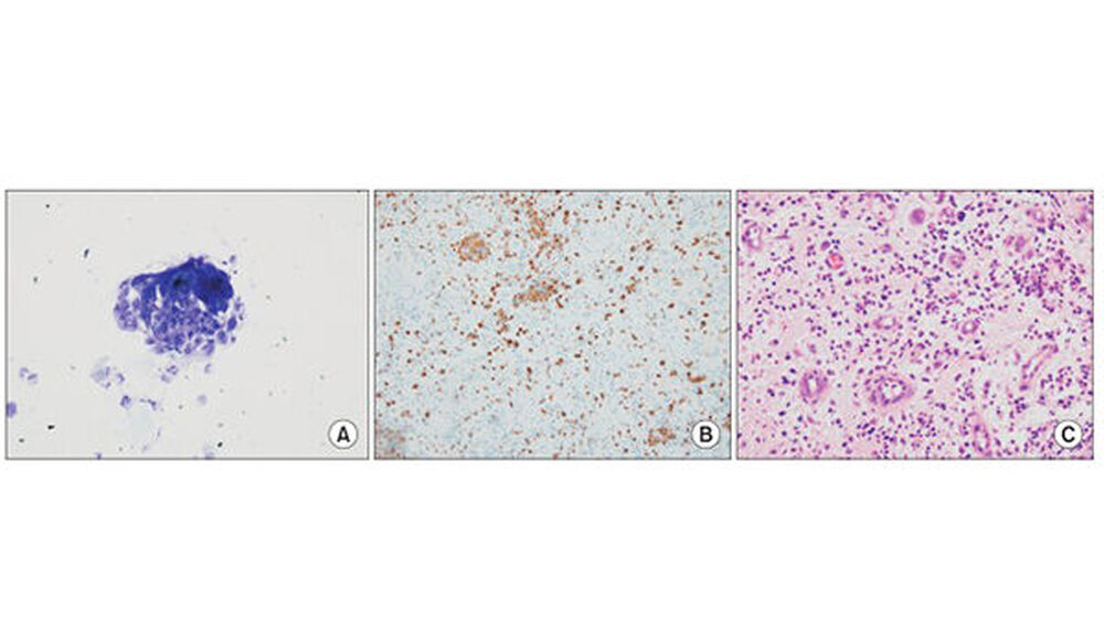 Histopathologisch wurden eosinophile intranukleare Einschlusskörper und mehrkernige Riesenzellen im Epithel identifiziert und die immunhistochemische Färbung zeigten die Zellen CD68 +. Was den nekrotischen Teil des Knochens betrifft, wurden neutrophile Granulozyten, Lymphozyten und Plasmazellen in den akuten und chronischen Entzündungen Bereichen bestimmt (Abb. 4).