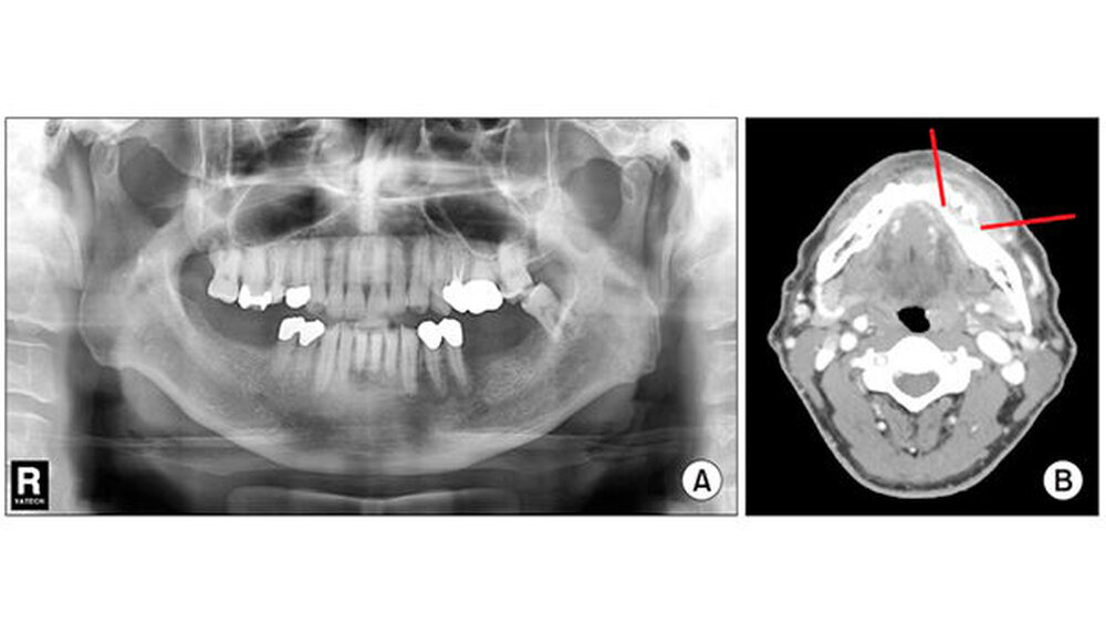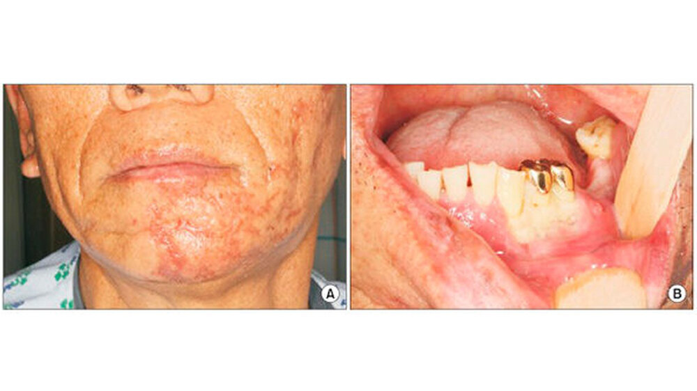 Ein 64-jähriger Mann stellte sich am 16. Dezember 2013 am Institut für Kiefer- und Gesichtschirurgie des Pusan National University Hospitals in Busan (Korea) vor. Er klagte über starke Schmerzen - sein Alveolarknochen des linken Unterkiefers lag komplett frei. Fünf Wochen zuvor hatte er eine Hautveränderung im linken Unterkieferbereich bemerkt, woraufhin ihm sein Hautarzt ein antivirales Mittel verschrieb. (Abb. 1 A). Davon abgesehen hatte er keine ernsten Beschwerden.