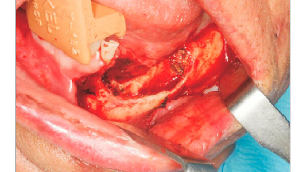 Die Zahnärzte fanden heraus, dass die Entzündung von den Zähnen herrührte. Sie diagnostizierten eine linke Unterkiefer-Osteonekrose infolge einer Gürtelrose des Gesichtsnervs (Nervus trigeminus. Abgestorbene Knochen- und Zahnfragmente (Sequester) wurden entfernt, die Zähne 31 bis 35 extrahiert (Abb. 3).