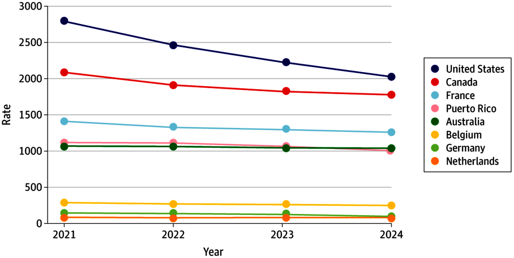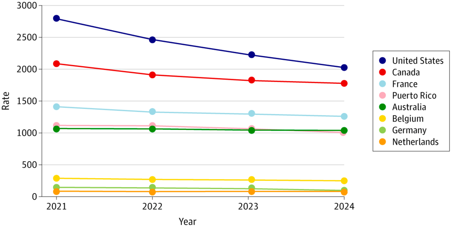 Weiteres Ergebnis: Bis Ende 2024 wiesen die USA weiterhin die höchste Rate solcher Rezeptabholungen auf, obwohl sie den Abstand zu Kanada, dem Land mit der zweithöchsten Rate, verringert hatten. Verglichen mit zum Beispiel Deutschland ist die Einlösungsrate von Opioid-Rezepten für zahnärztliche Zwecke in den USA aber enorm: Der Wert ist 20 Mal so hoch. In Deutschland wurden im Jahr 2024 nur 97 Opioid-Rezepte für zahnärztliche Zwecke pro 100.000 Einwohner eingelöst – in den USA waren es 2.022 pro 100.000 Einwohner.
