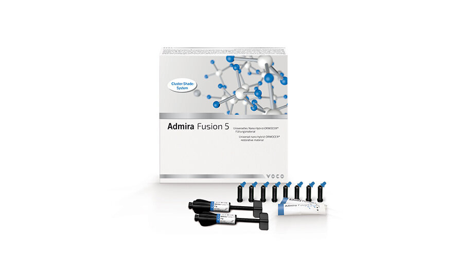 Die Lösung: Die Weiterentwicklung des rein keramisch basierten ORMOCER Füllungsmaterial Admira Fusion. Mit dem neuen Universal-Composite Admira Fusion 5 ist es möglich, alle VITA classical Farben mit nur fünf Cluster-Shades abzudecken. Admira Fusion 5 verwendet fünf verschiedene Cluster-Shades, die je mehrere VITA-Farben bündeln. Das sogenannte Cluster-Shade-System wird durch die neue patentierte Harzmatrix ermöglicht. Diese wurde auf die Größe und optischen Eigenschaften der Nano-Hybrid-Partikel angepasst, wodurch eine optimierte Lichtstreuung erreicht wird. Das Resultat: Ein Chamäleon-Effekt innerhalb der jeweiligen Cluster-Shade, der die ideale Anpassung an die natürliche Zahnfarbe erlaubt.