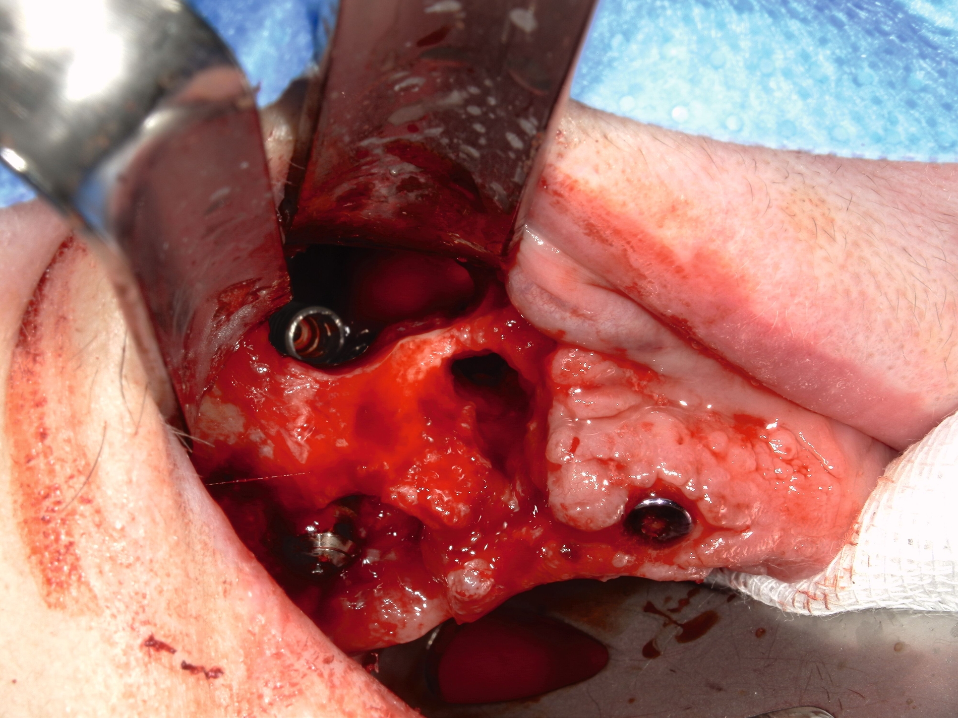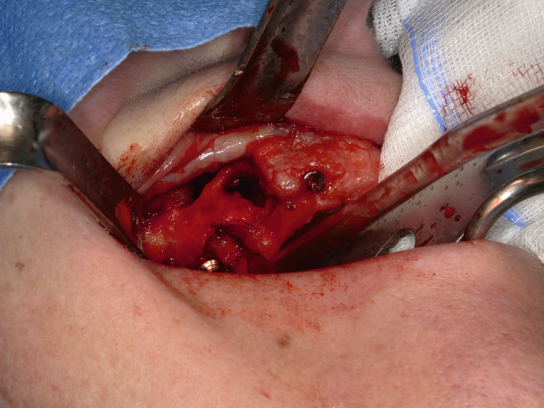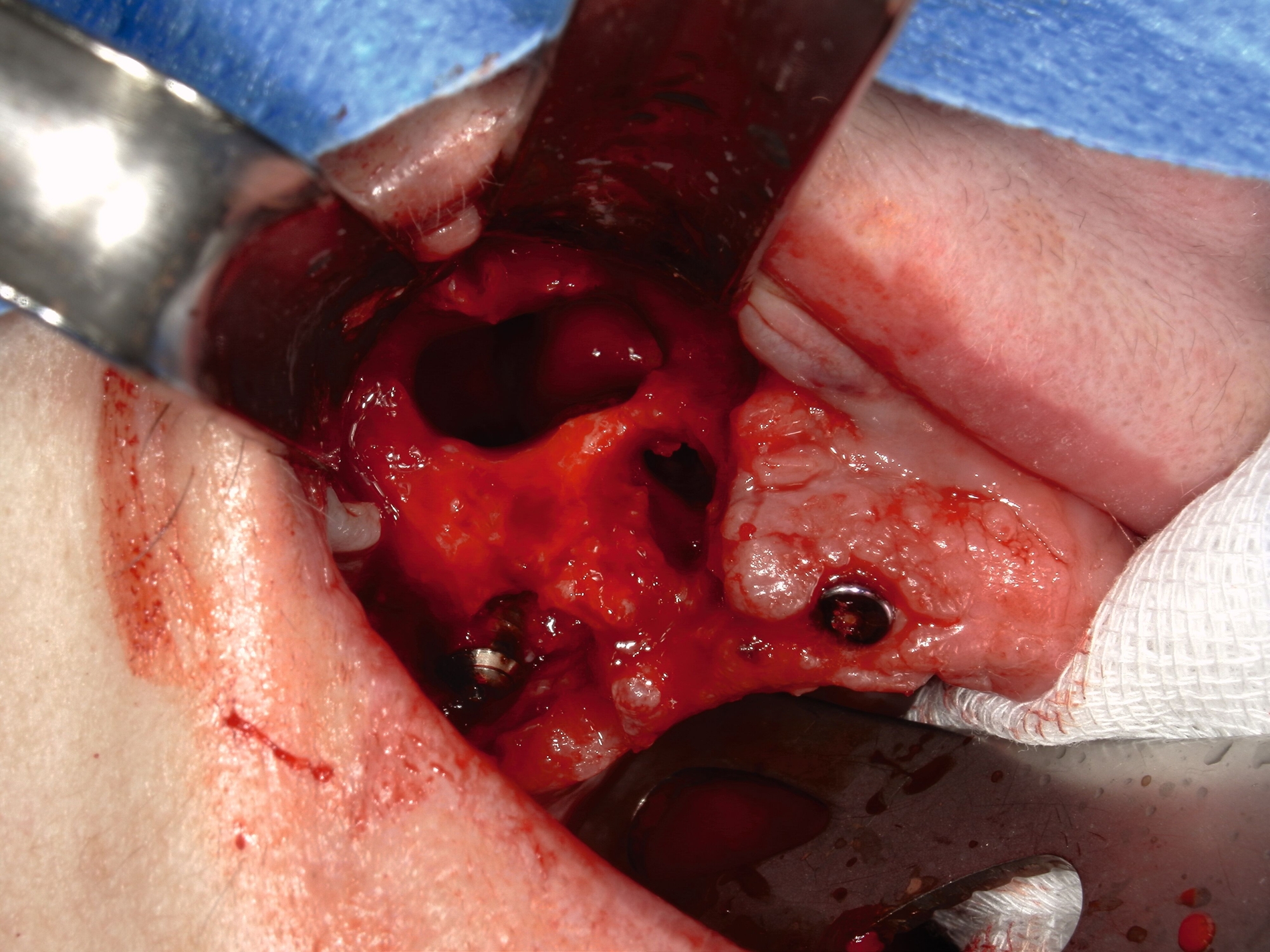 Aufgrund der bestehenden Infektionsgefahr durch die Kieferhöhlenbeteiligung wurde die Patientin über die Dringlichkeit eines chirurgischen Eingriffs mit nachfolgendem stationären Aufenthalt und intravenöser Antibiotikagabe aufgeklärt – sie stimmte dem Eingriff zu. Die Entfernung des dislozierten Implantats erfolgte unter Intubationsnarkose. Bei der Intervention zeigte sich eine mazerierte und durch die vorherigen Operationen stark geschädigte Gingiva (Abbildung 1).