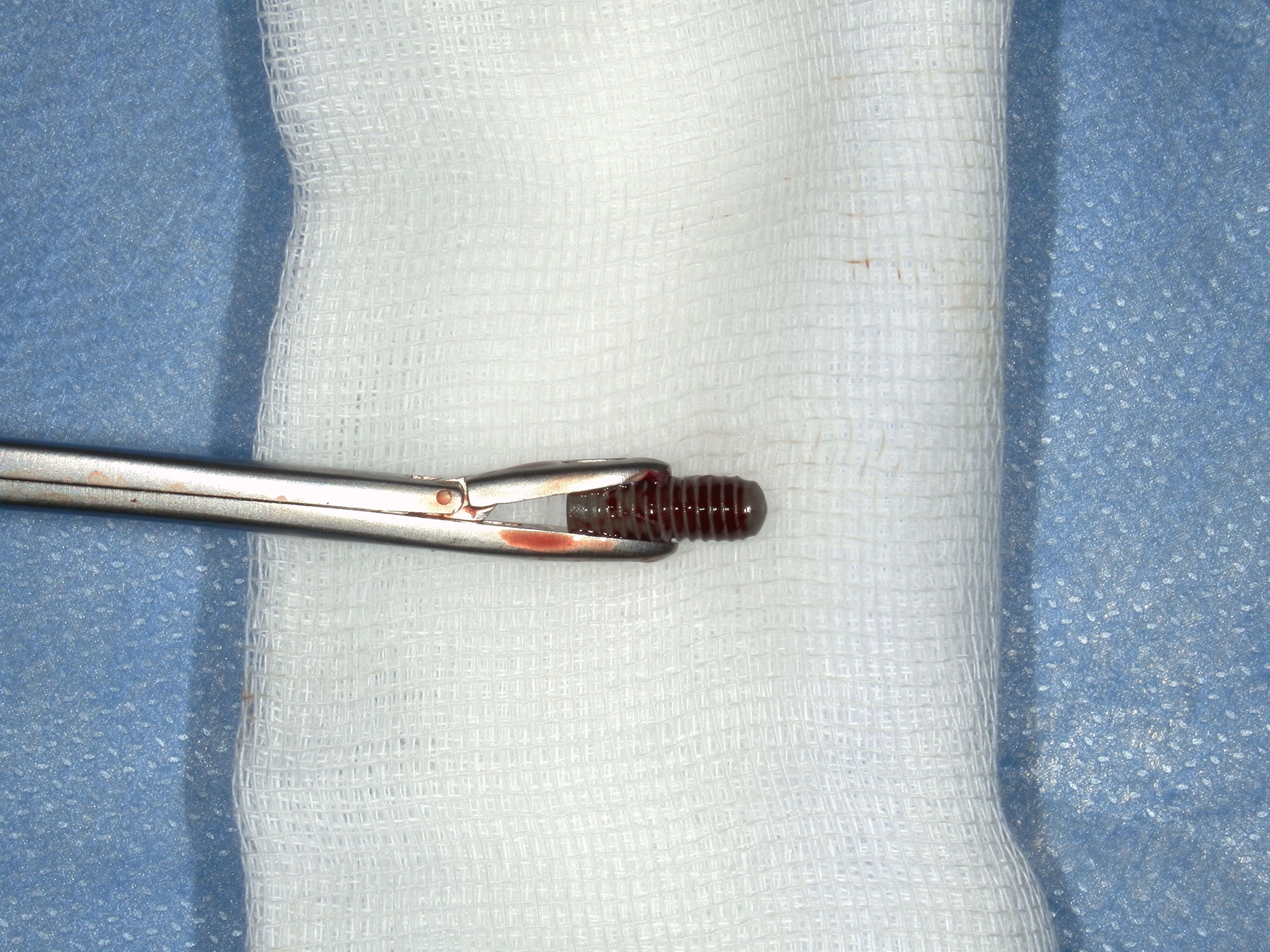 Durch die Mund-Antrum-Verbindung war keine Bergung des Implantats möglich, weshalb ein osteoklastischer Zugang mit Piezochirurgie in Regio 14 bis 16 erfolgte. Mithilfe einer endoskopischen Darstellung (30° Optik) der Kieferhöhle und einer Spülung konnte das Implantat erfolgreich geborgen werden (Abbildungen 5 bis 7).