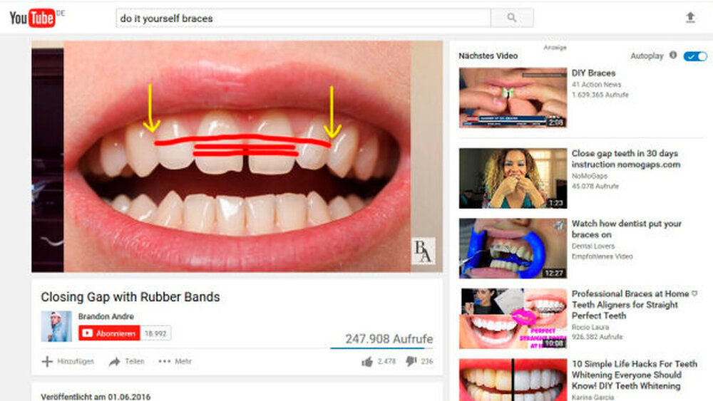 Zu den beliebtesten Haushaltsgegenständen für eine eigene Zahnkorrektur zählen laut Umfrage Gummibänder, Stricke und Büroklammern. Die befragten Kieferorthopäden berichten von Patientenfällen, bei denen sich die Zähne bereits erheblich gelockert haben oder von Fäden, die tief ins Zahnfleisch eingewachsen waren.