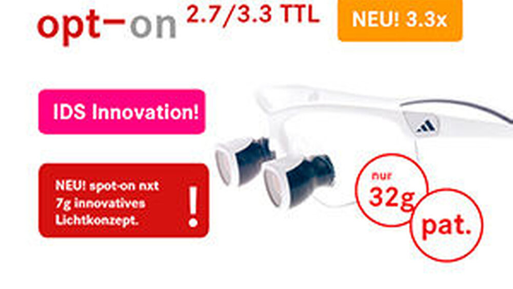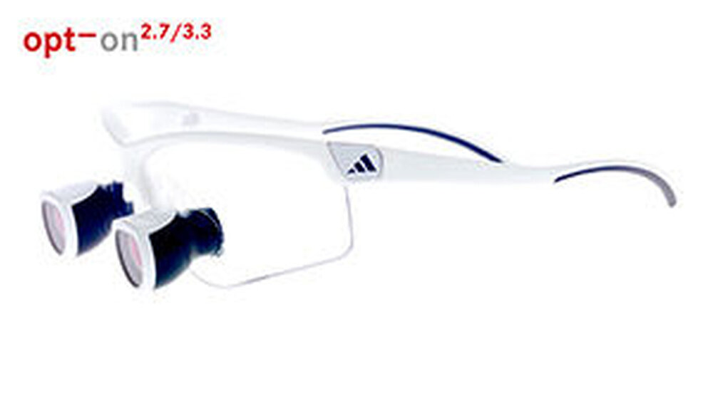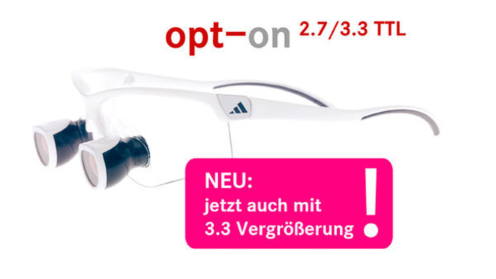 Die opt‐on von orangedental ist die einzige TTL-Lupenbrille bei der nachträglich der Arbeitsabstand durch die patentierten Vario‐Clips angepasst werden kann. Sie ist in den Vergrößerungen 2,7-fach oder 3,3-fach erhältlich.