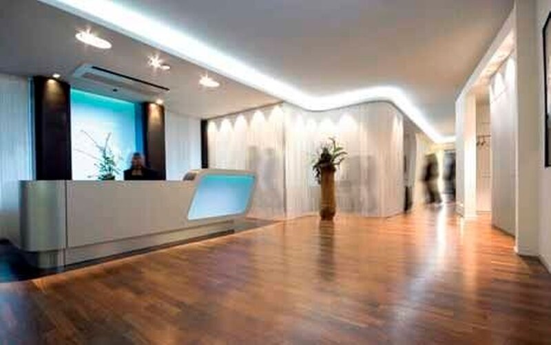 Nach dem Umbau erinnert nichts mehr an die ehemalige Nutzung. Statt enger Bürozellen wurde eine offene und helle Raumsituation mit fließenden Übergängen zwischen den unterschiedlichen Bereichen Empfang, Warten und Behandlung geschaffen. „Aufgrund der ästhetischen Ausrichtung legen die Patienten der Praxis großen Wert auf eine besondere Gestaltung, in der sie sich wohlfühlen“, erklärt Interior Designer Hubert Günther. „Um diese hohe Erwartung zu erfüllen, haben wir bewusst eine moderne und eindeutige Architektursprache mit hochwertigen Materialien und harmonischen Proportionen verfolgt.“ Markante Blickpunkte sind dabei die dunklen Fußböden aus geräuchertem Eichenparkett, die schon beim Betreten der Praxis eine großzügige und edle Atmosphäre schaffen, die transparenten Fadenvorhänge zwischen Empfang und Wartebereich sowie die geschwungene, hinterleuchtete Empfangstheke aus Aluminium, die mit ihrer veränderbaren Lichtsteuerung unterschiedliche Raumstimmungen erzeugt. Ein weiteres wichtiges Gestaltungselement ist die intelligente Lichtführung, die die Patienten vom Empfang bis in die jeweiligen Behandlungsbereiche leitet.