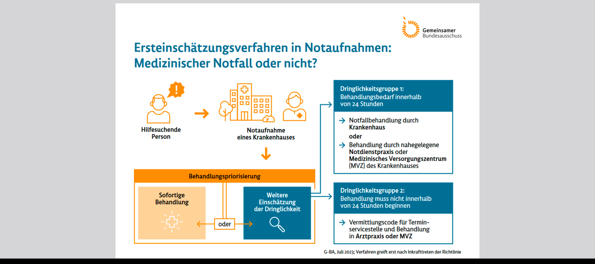Wie der G-BA dazu mitteilt, wird bereits in Notaufnahmen die Dringlichkeit einer ärztlichen, unmittelbar notwendigen Behandlung mit sogenannten Triagesystemen festgestellt, um Hilfesuchende mit einer lebensbedrohlichen Erkrankung oder Verletzung schnellstmöglichzu identifizieren und zu behandeln. Wenn kein sofortiger Behandlungsbedarf besteht, schließe sich zukünftig ein erweitertes Ersteinschätzungsverfahren an, das aufbauend auf dem Ergebnis der Triage das Zeitfenster bis zur Behandlung und die Versorgungsebene vorgibt. Je nachdem, ob eine ärztliche Behandlung innerhalb von 24 Stunden beginnen sollte oder nicht, werden laut der neuen G-BA-Richtlinie zwei sogenannte Dringlichkeitsgruppen unterschieden: