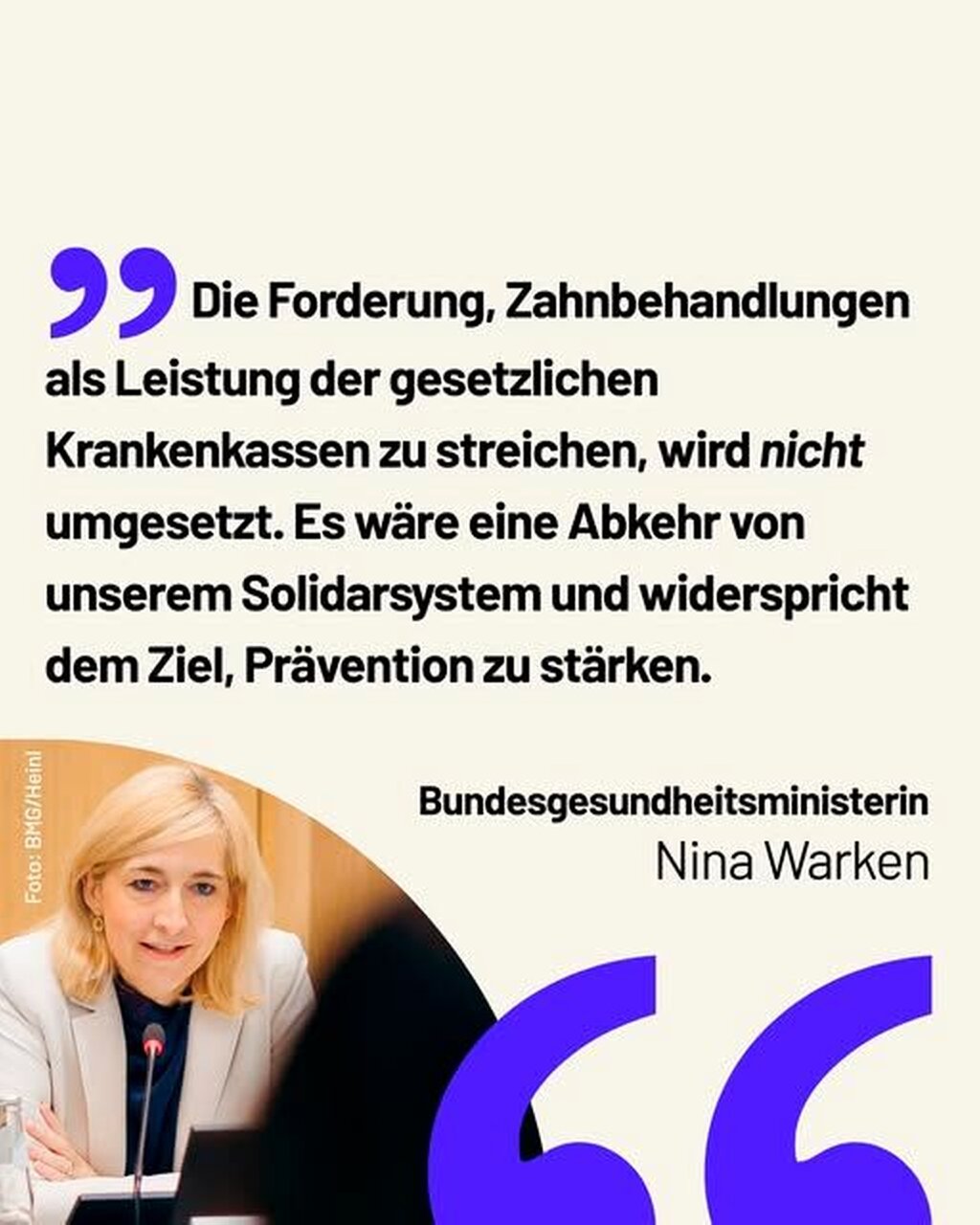 „Die Forderung, Zahnbehandlungen aus dem Leistungskatalog der GKV zu streichen, wird nicht umgesetzt. Das schließe ich aus, denn es wäre eine Abkehr des Kerngedankens unseres Solidarsystems und widerspricht dem Ziel, Prävention zu stärken“, erklärte Warken. Der stellvertretende Regierungssprecher Steffen Meyer bestätigte, dass es derartige Pläne in der Bundesregierung nicht gebe.