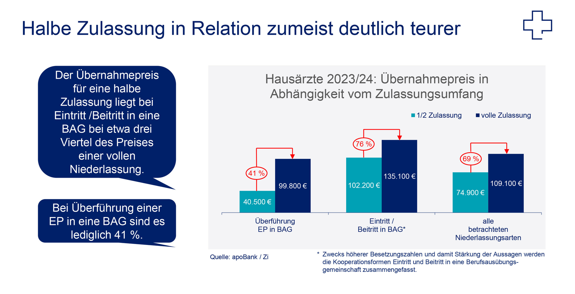 Arbeiten in Teilzeit ist für Niedergelassene grundsätzlich auch mit einer Teilzulassung möglich: Jede fünfte Überführung einer Einzelpraxis in eine Berufsausübungsgemeinschaft (BAG) erfolgt mit halben Zulassungen. Durchschnittlich zahlen Hausärztinnen und Hausärzte in solchen Fällen weniger als die Hälfte des vollen Übernahmepreises. Der Eintritt beziehungsweise Beitritt in eine bereits bestehende BAG ist dagegen verhältnismäßig teuer und beträgt drei Viertel des Kaufpreises für eine volle Niederlassung.